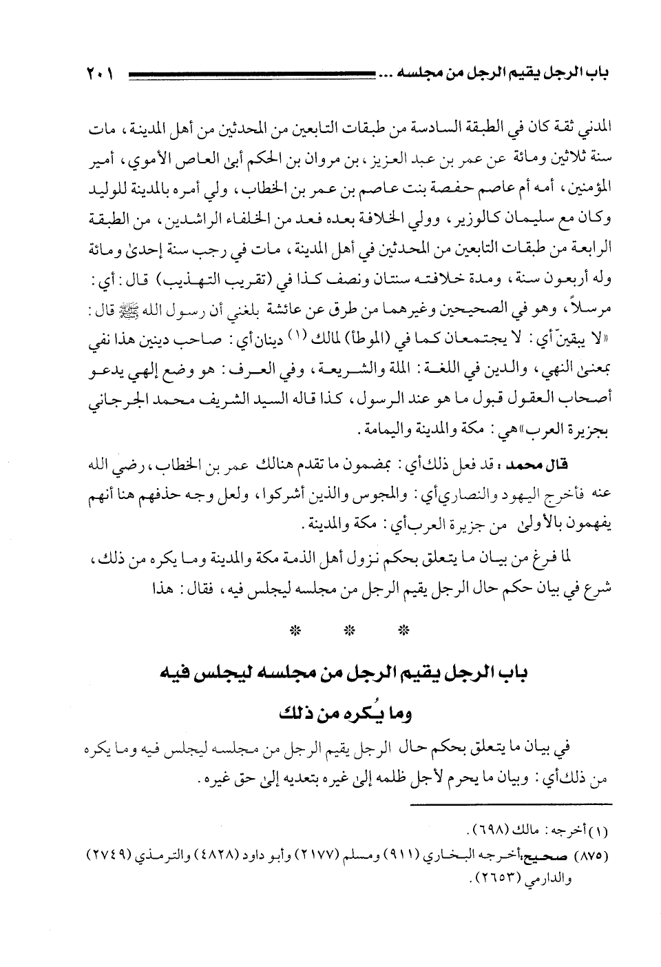 لما فرغ من بيان ما يتعلق بحكم نزول أهل الذمة مكة والمدينة وما يكره من ذلك، شرع في بيان حكم حال الرجل يقيم الرجل من مجلسه ليجلس فيه، فقال: هذا