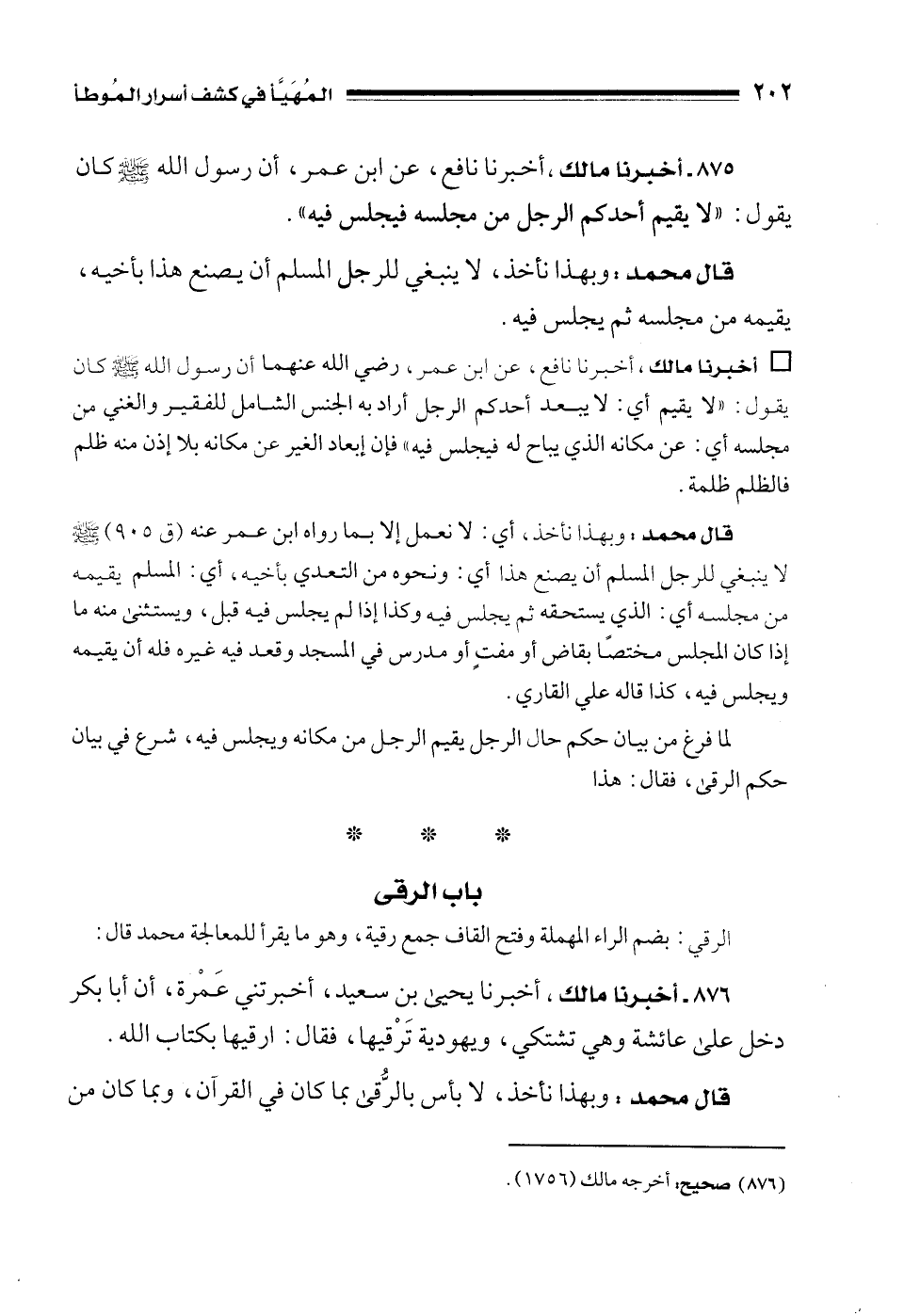 قال محمد: وبهذا نأخذ، أي: لا نعمل إلا بما رواه ابن عمر عنه (ق 905) - صلى الله عليه وسلم - لا ينبغي للرجل المسلم أن يصنع هذأ أي: ونحوه من التعدي بأخيه، أي: المسلم يقيمه من مجلسه أي: الذي يستحقه ثم يجلس فيه وكذا إذا لم يجلس فيه قبل، ويستثنى منه ما إذا كان المجلس مختصًا بقاض أو مفتٍ أو مدرس في المسجد وقعد فيه غيره فله أن يقيمه ويجلس فيه، كذا قاله علي القاري.