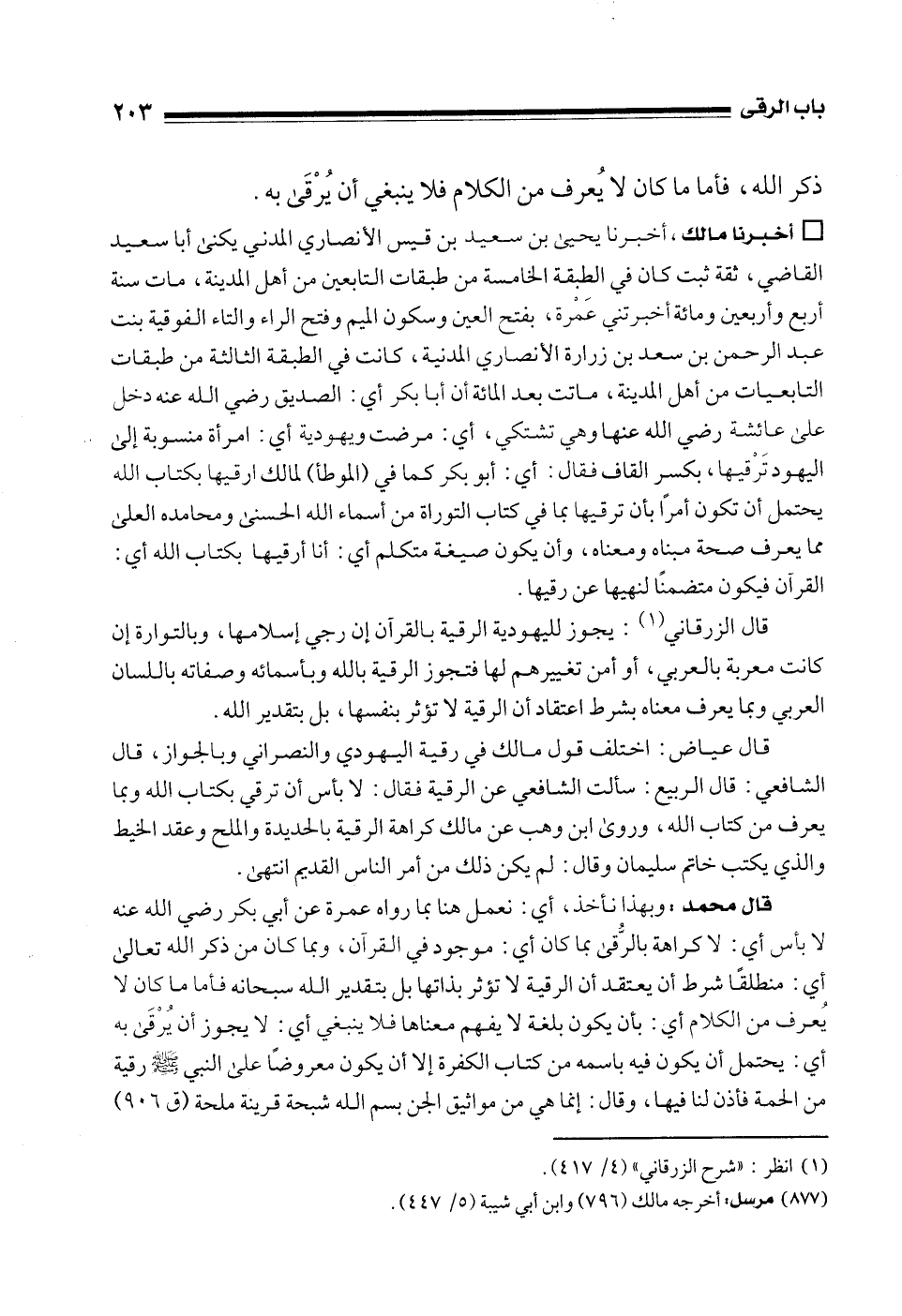 قال محمد: وبهذا نأخذ، أي: نعمل هنا بما رواه عمرة عن أبي بكر رضي الله عنه لا بأس أي: لا كراهة بالرُّقى بما كان أي: موجود في القرآن، وبما كان من ذكر الله تعالى أي: منطلقًا شرط أن يعتقد أن الرقية لا تؤثر بذاتها بل بتقدير الله سبحانه فأما ما كان لا يُعرف من الكلام أي: بأن يكون بلغة لا يفهم معناها فلا ينبغي أي: لا يجوز أن يُرْقَى به أي: يحتمل أن يكون فيه باسمه من كتاب الكفرة إلا أن يكون معروضًا على النبي - صلى الله عليه وسلم - رقية من الحمة فأذن لنا فيها، وقال: إنما هي من مواثيق الجن بسم الله شبحة قرينة ملحة (ق 906)