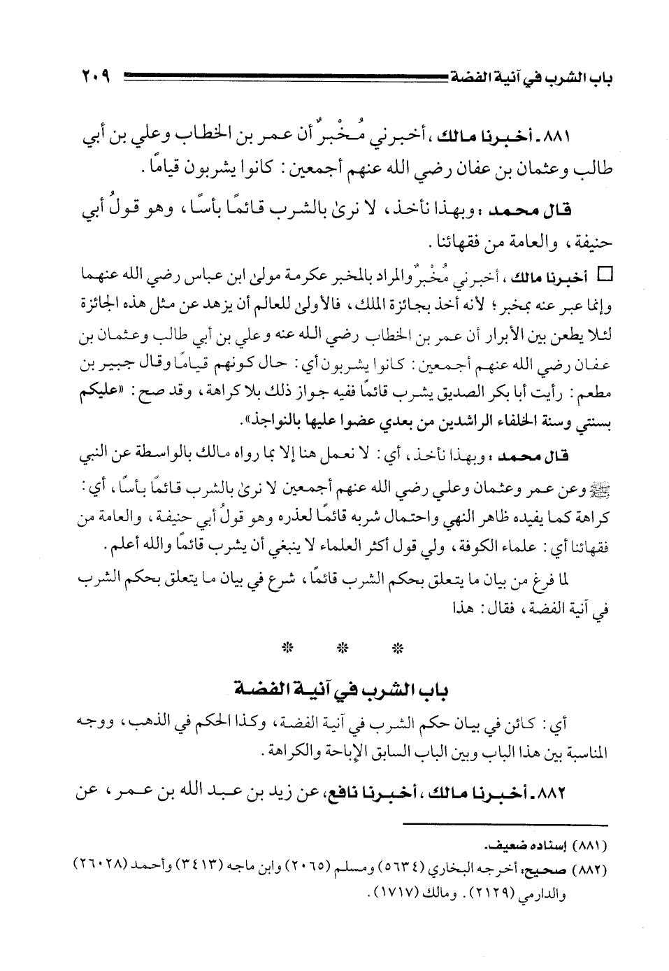 881 - أخبرنا مالك، أخبرني مُخْبرٌ أن عمر بن الخطاب وعلي بن أبي طالب وعثمان بن عفان رضي الله عنهم أجمعين: كانوا يشربون قيامًا.