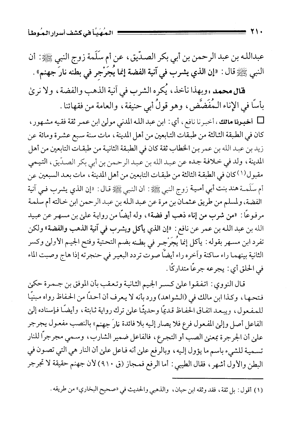 • أخبرنا مالك، أخبرنا نافع, أي: ابن عبد الله المدني مولى ابن عمر ثقة فقيه مشهور، كان في الطبقة الثالثة من طبقات التابعين من أهل المدينة، مات سنة سبع عشرة ومائة عن زيد بن عبد الله بن عمر بن الخطاب ثقة كان في الطبقة الثانية من طبقات التابعين من أهل المدينة، ولد في خلافة جده عن عبد الله بن عبد الرحمن بن أبي بكر الصدّيق، التيمي مقبول (¬1) كان في الطبقة الثالثة من طبقات التابعين من أهل المدينة، مات بعد السبعين عن أم سَلَمة هند بنت أبي أمية زوج النبي - صلى الله عليه وسلم -: أن النبي - صلى الله عليه وسلم - قال: "إن الذي يشرب في آنية الفضة، ولمسلم من طريق عثمان بن مرة عن عبد الله بن عبد الرحمن ابن خالته أم سلمة مرفوعًا: "من شرب من إناء ذهب أو فضة"، وله أيضًا من رواية على بن مسهر عن عبيد الله بن عبد الله بن عمر عن نافع: "إن الذي يأكل ويشرب في آنية الذهب والفضة" ولكن تفرد ابن مسهر بقوله: يأكل إنما يُجَرْجِر في بطنه بضم التحتية وفتح الجيم الأولى وكسر الثانية بينهما راء ساكنة وآخره راء أيضًا صوت تردد البعير في حنجرته إذا هاج وصبت الماء في الحلق أي: يجرعه جرعًا متداركًا.