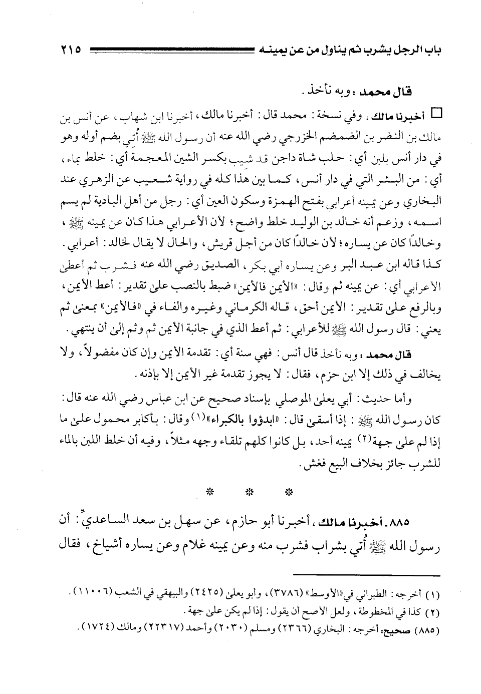 قال محمد: وبه نأخذ قال أنس: فهي سنة أي: تقدمة الأيمن وإن كان مفضولًا، ولا يخالف في ذلك إلا ابن حزم، فقال: لا يجوز تقدمة غير الأيمن إلا بإذنه.