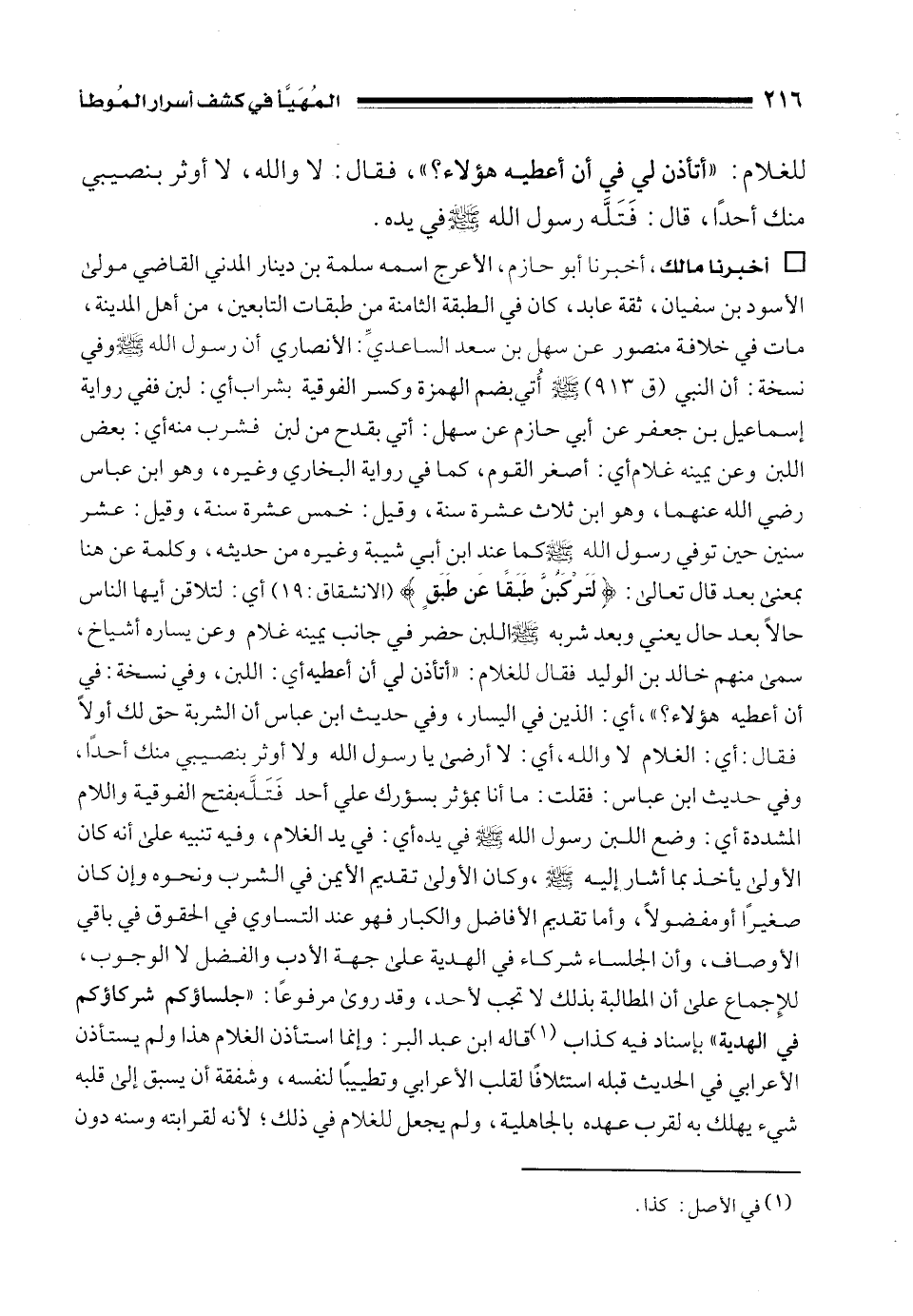 • أخبرنا مالك، أخبرنا أبو حازم، الأعرج اسمه سلمة بن دينار المدني القاضي مولى الأسود بن سفيان، ثقة عابد، كان في الطبقة الثامنة من طبقات التابعين، من أهل المدينة، مات في خلافة منصور عن سهل بن سعد الساعديِّ: الأنصاري أن رسول الله - صلى الله عليه وسلم - وفي نسخة: أن النبي (ق 913) - صلى الله عليه وسلم - أُتي بضم الهمزة وكسر الفوقية بشراب أي: لبن ففي رواية إسماعيل بن جعفر عن أبي حازم عن سهل: أتي بقدح من لبن فشرب منه أي: بعض اللبن وعن يمينه غلام أي: أصغر القوم، كما في رواية البخاري وغيره، وهو ابن عباس رضي الله عنهما، وهو ابن ثلاث عشرة سنة، وقيل: خمس عشرة سنة، وقيل: عشر سنين حين توفي رسول الله - صلى الله عليه وسلم - كما عند ابن أبي شيبة وغيره من حديثه، وكلمة عن هنا بمعنى بعد قال تعالى: {لَتَرْكَبُنَّ طَبَقًا عَنْ طَبَقٍ} [الانشقاق: 19] أي: لتلاقن أيها الناس حالًا بعد حال يعني وبعد شربه - صلى الله عليه وسلم - اللبن حضر في جانب يمينه غلام وعن يساره أشياخ، سمى منهم خالد بن الوليد فقال للغلام: "أتأذن لي أن أعطيه أي: اللبن، وفي نسخة: في أن أعطيه هؤلاء؟ "، أي: الذين في اليسار، وفي حديث ابن عباس أن الشربة حق لك أولًا فقال: أي: الغلام لا والله, أي: لا أرضى يا رسول الله ولا أوثر بنصيبي منك أحدًا، وفي حديث ابن عباس: فقلت: ما أنا بمؤثر بسؤرك علي أحد فَتَلَّه بفتح الفوقية واللام المشددة أي: وضع اللبن رسول الله - صلى الله عليه وسلم - في يده أي: في يد الغلام، وفيه تنبيه على أنه كان الأولى يأخذ بما أشار إليه - صلى الله عليه وسلم -، وكان الأولى تقديم الأيمن في الشرب ونحوه وإن كان صغيرًا أو مفضولًا، وأما تقديم الأفاضل والكبار فهو عند التساوي في الحقوق في باقي الأوصاف، وأن الجلساء شركاء في الهدية على جهة الأدب والفضل لا الوجوب، للإِجماع على أن المطالبة بذلك لا تجب لأحد، وقد روى مرفوعًا: "جلساؤكم شركاؤكم في الهدية" بإسناد فيه كذاب (¬1) قاله ابن عبد البر: وإنما استأذن الغلام هذا ولم يستأذن الأعرابي في الحديث قبله استئلافًا لقلب الأعرابي وتطييبًا لنفسه، وشفقة أن يسبق إلى قلبه شيء يهلك به لقرب عهده بالجاهلية، ولم يجعل للغلام في ذلك؛ لأنه لقرابته وسنه دون