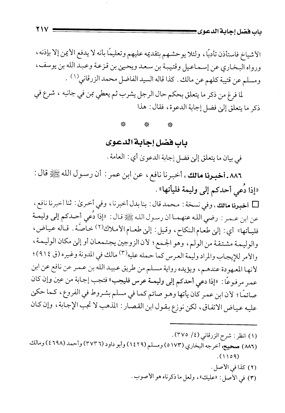886 - أخبرنا مالك، أخبرنا نافع، عن ابن عمر: أن رسول الله - صلى الله عليه وسلم - قال: "إذا دُعي أحدكم إلى وليمة فليأتها".