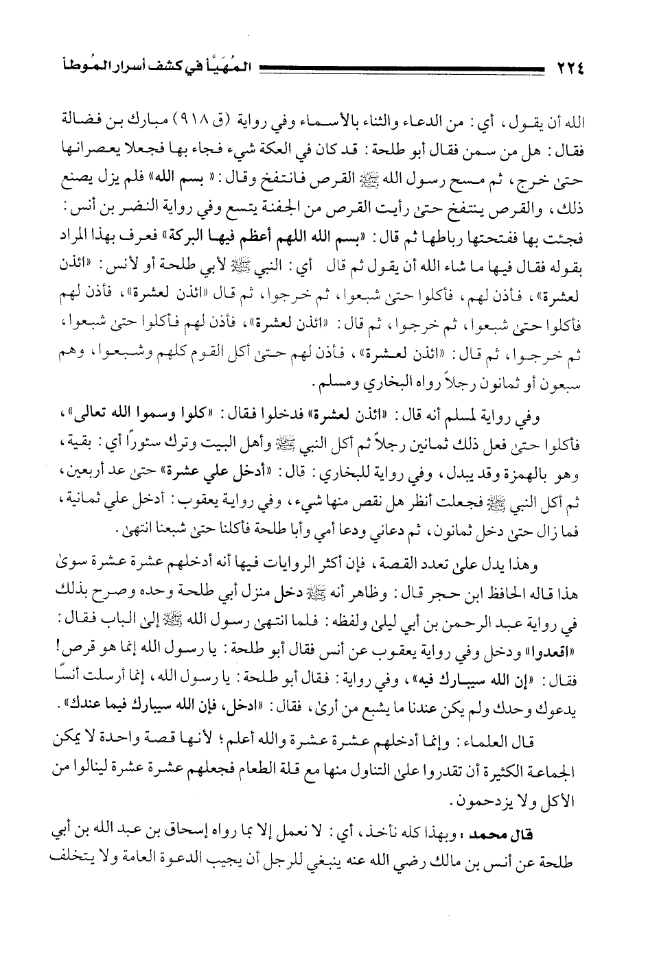 الله أن يقول، أي: من الدعاء والثناء بالأسماء وفي رواية (ق 918) مبارك بن فضالة فقال: هل من سمن فقال أبو طلحة: قد كان في العكة شيء فجاء بها فجعلا يعصرانها حتى خرج، ثم مسح رسول الله - صلى الله عليه وسلم - القرص فانتفخ وقال: "بسم الله" فلم يزل يصنع ذلك، والقرص ينتفخ حتى رأيت القرص من الجفنة يتسع وفي رواية النضر بن أنس: فجئت بها ففتحتها رباطها ثم قال: "بسم الله اللهم أعظم فيها البركة" فعرف بهذا المراد بقوله فقال فيها ما شاء الله أن يقول ثم قال أي: النبي - صلى الله عليه وسلم - لأبي طلحة أو لأنس: "ائذن لعشرة"، فأذن لهم، فأكلوا حتى شبعوا، ثم خرجوا، ثم قال "ائذن لعشرة"، فأذن لهم فأكلوا حتى شبعوا، تم خرجوا، تم قال: "ائذن لعشرة"، فأذن لهم فأكلوا حتى شبعوا، ثم خرجوا، ثم قال: "ائذن لعشرة"، فأذن لهم حتى أكل القوم كلهم وشبعوا، وهم سبعون أو ثمانون رجلًا رواه البخاري ومسلم.