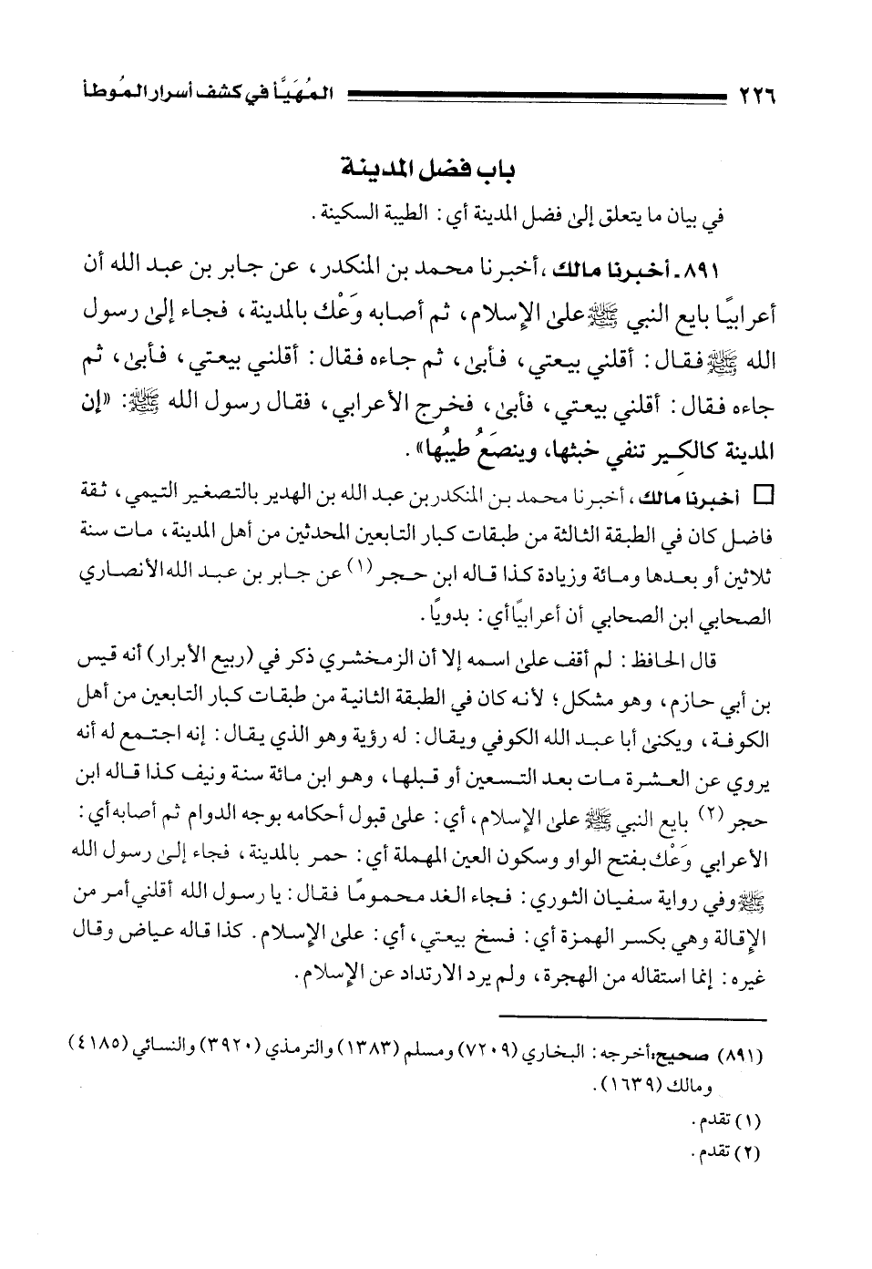 891 - أخبرنا مالك، أخبرنا محمد بن المنكدر، عن جابر بن عبد الله أن أعرابيًا بايع النبي - صلى الله عليه وسلم - على الإِسلام، ثم أصابه وَعْك بالمدينة، فجاء إلى رسول الله - صلى الله عليه وسلم - فقال: أقلني بيعتي، فأبى، ثم جاءه فقال: أقلني بيعتي، فأبى، ثم جاءه فقال: أقلني بيعتي، فأبى، فخرج الأعرابي، فقال رسول الله - صلى الله عليه وسلم -: "إن المدينة كالكِير تنفي خبثها، وينصَعُ طيبُها".