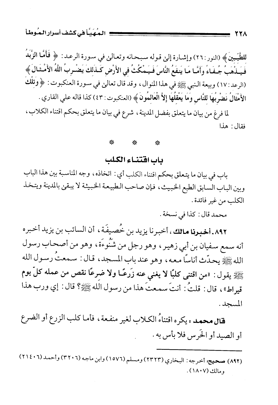 892 - أخبرنا مالك، أخبرنا يزيد بن خُصيفَة، أن السائب بن يزيد أخبره أنه سمع سفيان بن أبي زهير، وهو رجل من شَنُوءَة، وهو من أصحاب رسول الله - صلى الله عليه وسلم - يحدّث أناسًا معه، وهو عند باب المسجد، قال: سمعتُ رسول الله - صلى الله عليه وسلم - يقول: "من اقتنى كلبًا لا يغني عنه زَرعًا ولا ضرعًا نقص من عمله كلّ يوم قيراط"، قال: قلتُ: أنتَ سمعتَ هذا من رسول الله - صلى الله عليه وسلم -؟ قال: إي ورب هذا المسجد.