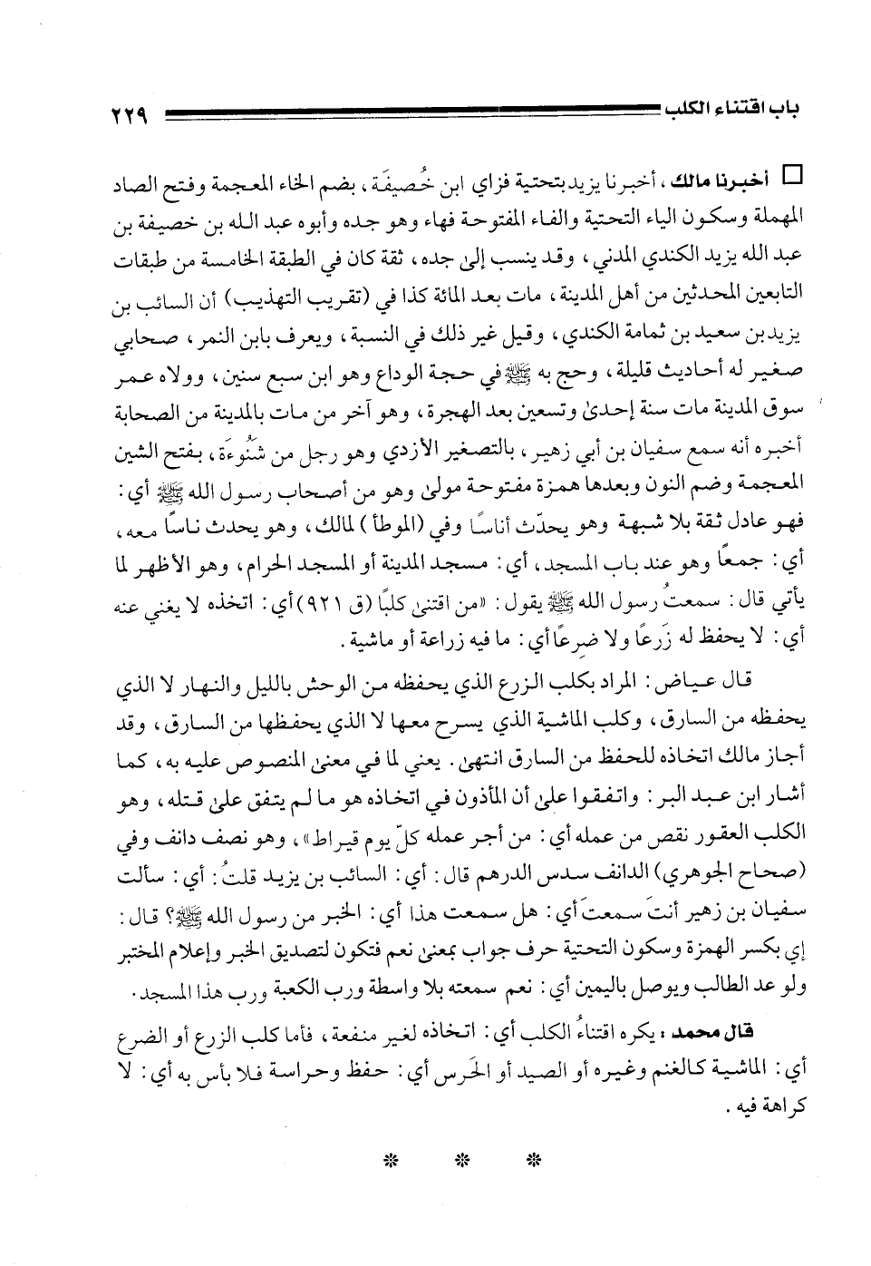 قال محمد: يكره اقتناءُ الكلب أي: اتخاذه لغير منفعة، فأما كلب الزرع أو الضرع أي: الماشية كالغنم وغيره أو الصيد أو الحَرس أي: حفظ وحراسة فلا بأس به أي: لا كراهة فيه.