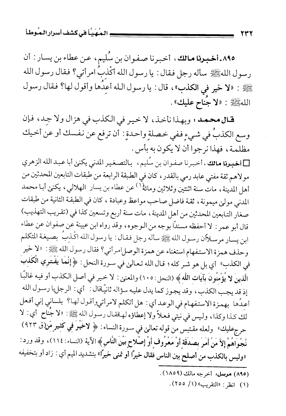 895 - أخبرنا مالك، أخبرنا صفوان بن سُليم، عن عطاء بن يسار: أن رسول الله - صلى الله عليه وسلم - سأله رجل فقال: يا رسول الله أكْذِبُ امرأتي؟ فقال رسول الله - صلى الله عليه وسلم -: "لا خير في الكذب"، قال: يا رسول الله أعِدُها وأقول لها؟ فقال رسول الله - صلى الله عليه وسلم -: "لا جُناح عليك".