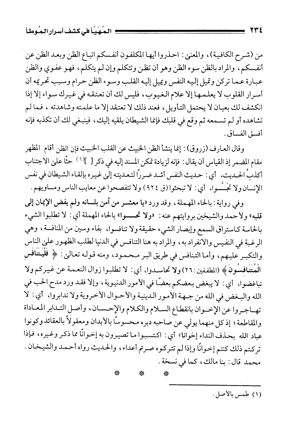 وقال العارف (زروق): إنما ينشأ الظن الخبيث عن القلب الخبيث فإن الظن أقام المظهر مقام المضمر إذ القياس أن يقال: فإنه لزيادة تمكن المسند إليه في ذكر [] (¬1) حثًا على الاجتناب أكذبُ الحديث, أي: حديث النفس أشد ضررًا لتعديته إلى غيره بإلقاء الشيطان في نفس الإِنسان ولا تجَسَّسوا, أي: لا تبحثوا (ق 924) ولا تتفصحوا عن معايب الناس ومساويهم.