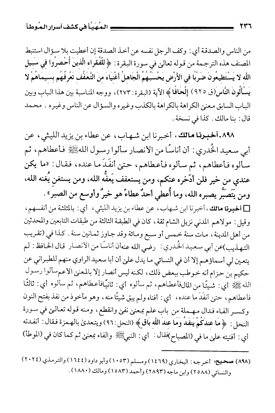 • أخبرنا مالك، أخبرنا ابن شهاب، عن عطاء بن يزيد الليثي, أي: بالمثلثة من أنفسهم، وقيل: مولاهم المدني نزيل الشام ثقة، كان في الطبقة الثالثة من طبقات التابعين والمحدثين من أهل المدينة، مات سنة خمس أو سبع ومائة وقد جاوز ثمانين سنة. كذا في (تقريب التهذيب) عن أبي سعيد الخُدري: رضي الله عنه أن أناسًا من الأنصار قال الحافظ: لم يتعين لي أسماؤهم إلا أن في النسائي ما يدل على أن أبا سعيد الراوي منهم للطبراني عن حكيم بن حزام أنه خوطب ببعض ذلك، لكنه ليس أنصار إلا بالمعنى الأعم سألوا رسول الله - صلى الله عليه وسلم - أي: شيئًا من المال فأعطاهم، ثم سألوه أي: ثانيًا فأعطاهم، ثم سألوه أي: ثالثًا فأعطاهم، حتى أنفَدَ ما عنده, أي: أفناه ولم يبق شيئًا منه، وهو مأخوذ من نفذ بفتح النون وكسر الفاء فدال مهملة من باب علم بمعنى نفى وانقطع، ومنه قوله تعالى في سورة النحل: {مَا عِنْدَكُمْ يَنْفَدُ وَمَا عِنْدَ اللَّهِ بَاقٍ} [النحل: 96] ويتعدى بالهمزة فقال: أنفدته أي: أفنيته على ما في (المصباح) فقال: أي: النبي - صلى الله عليه وسلم - والفاء بمعنى ثم كما كان في (الموطأ)
