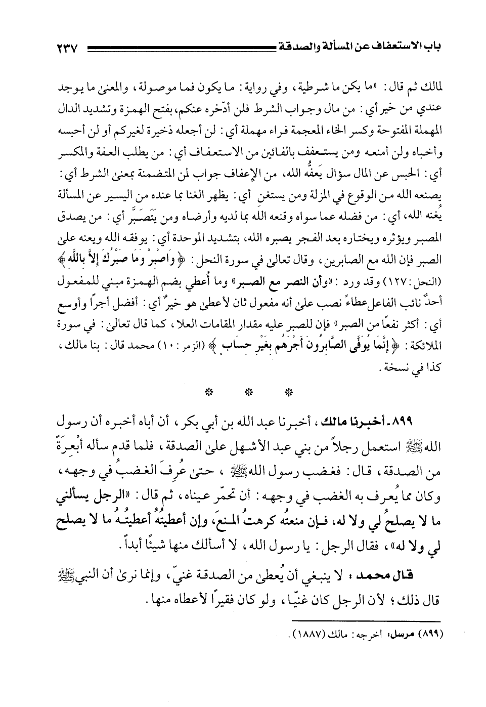 899 - أخبرنا مالك، أخبرنا عبد الله بن أبي بكر، أن أباه أخبره أن رسول الله - صلى الله عليه وسلم - استعمل رجلًا من بني عبد الأشهل على الصدقة، فلما قدم سأله أبْعِرَةً من الصدقة، قال: فغضب رسول الله - صلى الله عليه وسلم -، حتى عُرِفَ الغضبُ في وجهه، وكان مما يُعرف به الغضب في وجهه: أن تحمّر عيناه، ثم قال: "الرجل يسألني ما لا يصلحُ لي ولا له، فإن منعتُه كرهتُ المنعَ، وإن أعطيتُهُ أعطيتُهُ ما لا يصلح لي ولا له"، فقال الرجل: يا رسول الله، لا أسألك منها شيئًا أبدًا.