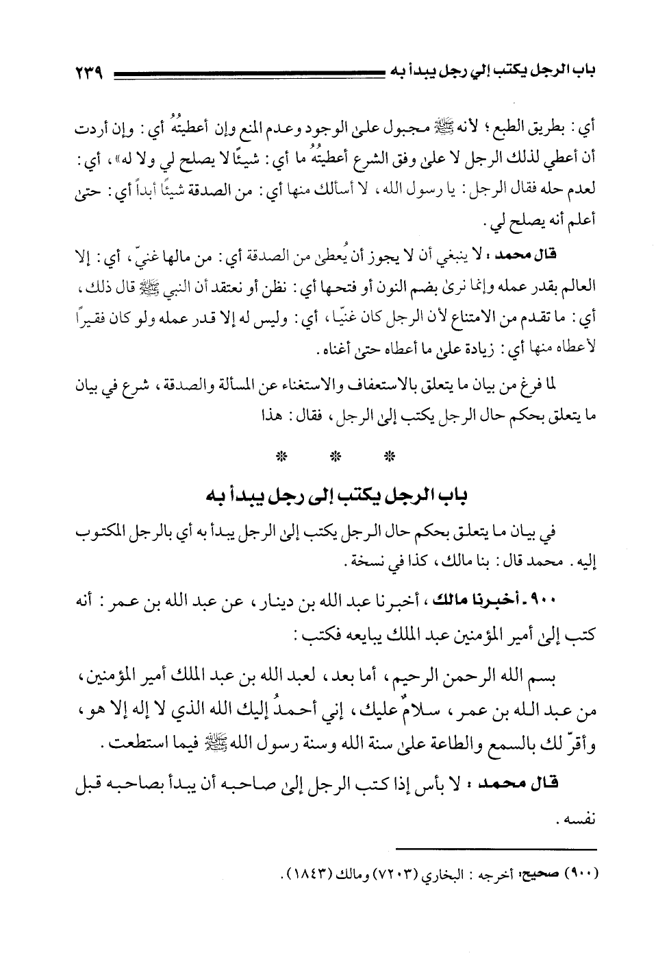في بيان ما يتعلق بحكم حال الرجل يكتب إلى الرجل يبدأ به أي بالرجل المكتوب إليه. محمد قال: بنا مالك، كذا في نسخة.