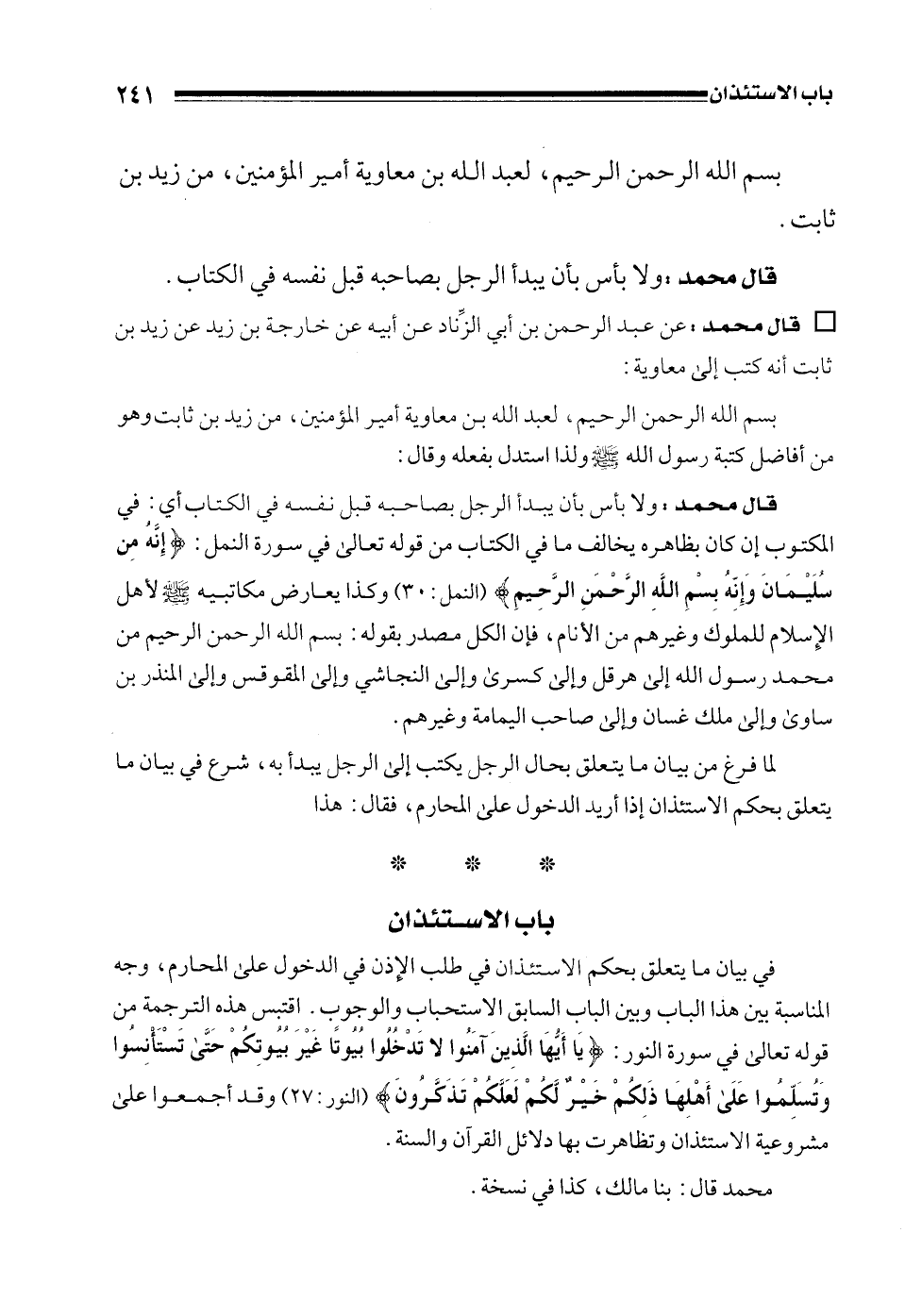 لما فرغ من بيان ما يتعلق بحال الرجل يكتب إلى الرجل يبدأ به، شرع في بيان ما يتعلق بحكم الاستئذان إذا أريد الدخول على المحارم، فقال: هذا