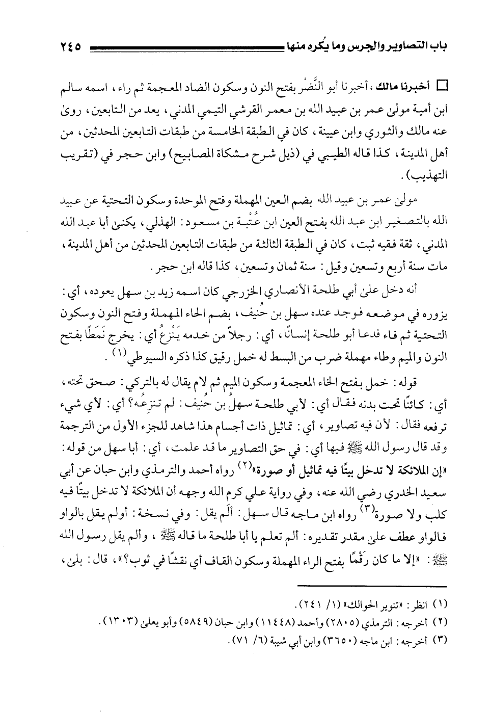 • أخبرنا مالك، أخبرنا أبو النَّضر بفتح النون وسكون الضاد المعجمة ثم راء، اسمه سالم بن أمية مولى عمر بن عبيد الله بن معمر القرشي التيمي المدني، يعد من التابعين، روى عنه مالك والثوري وابن عيينة، كان في الطبقة الخامسة من طبقات التابعين المحدثين، من أهل المدينة، كذا قاله الطيبي في (ذيل شرح مشكاة المصابيح) وابن حجر في (تقريب التهذيب).