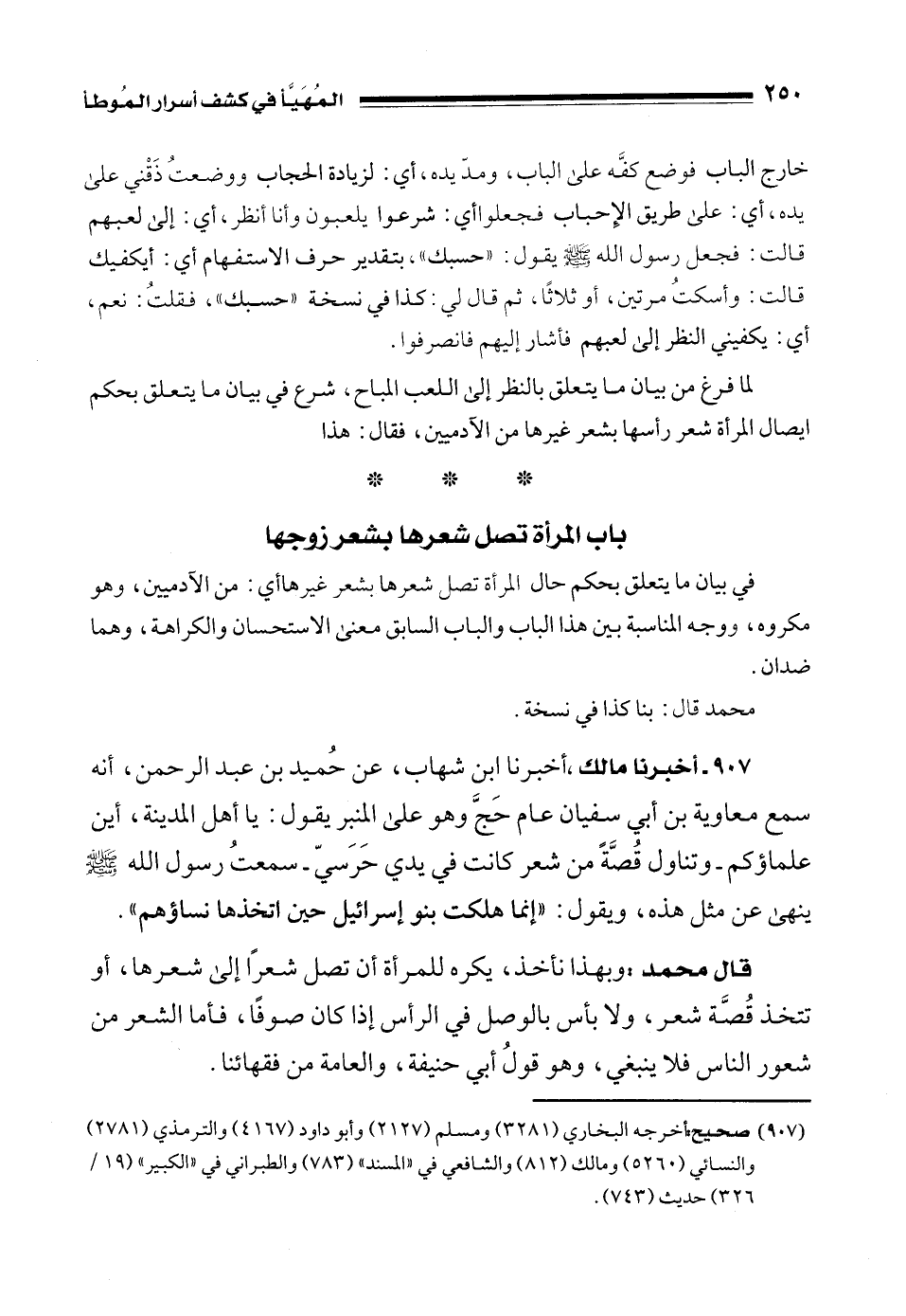 907 - أخبرنا مالك، أخبرنا ابن شهاب، عن حُميد بن عبد الرحمن، أنه سمع معاوية بن أبي سفيان عام حَجَّ وهو على المنبر يقول: يا أهل المدينة, أين علماؤكم - وتناول قُصَّةً من شعر كانت في يدي حَرَسيّ - سمعتُ رسول الله - صلى الله عليه وسلم - ينهى عن مثل هذه، ويقول: "إنما هلكت بنو إسرائيل حين اتخذها نساؤهم".