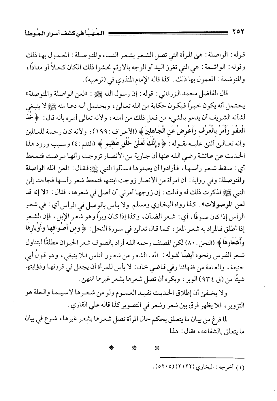 قال الفاضل محمد الزرقاني: قوله: إن رسول الله - صلى الله عليه وسلم -: "لعن الواصلة والمتوصلة" يحتمل أنه يكون خبرًا فيكون حكاية من الله تعالى، ويحتمل أنه دعا منه - صلى الله عليه وسلم - لا ينبغي لشأنه الشريف أن يدعو بالشيء من فعل ذلك من أمته، ولأنه تعالى أمره بأنه قال: {خُذِ الْعَفْوَ وَأْمُرْ بِالْعُرْفِ وَأَعْرِضْ عَنِ الْجَاهِلِينَ} [الأعراف: 199]؛ ولأنه كان رحمة للعالمين وأنه تعالى أثنى عليه بقوله: {وَإِنَّكَ لَعَلَى خُلُقٍ عَظِيمٍ} [القلم: 4] وسبب ورود هذا الحديث عن عائشة رضي الله عنها أن جارية من الأنصار تزوجت وأنها مرضت فتمعط أي: سقط شعر رأسها، فأرادوا أن يصلوها فسألوا النبي - صلى الله عليه وسلم - فقال: "لعن الله الواصلة والمتوصلة" وفي رواية: أن امرأة من الأنصار زوجت ابنتها فتمعط شعر رأسها فجاءت إلى النبي - صلى الله عليه وسلم - فذكرت ذلك له وقالت: إن زوجها أمرني أن أصل في شعرها، فقال: "لا إنه قد لعن الموصولات". (¬1) كذا رواه البخاري ومسلم ولا بأس بالوصل في الرأس أي: في شعر الرأس إذا كان صوفًا, أي: شعر الضأن، وكذا إذا كان وبرًا وهو شعر الإِبل، فإن الشعر إذا أطلق فالمراد به شعر المعز، كما قال تعالى في سورة النحل: {وَمِنْ أَصْوَافِهَا وَأَوْبَارِهَا وَأَشْعَارِهَا} [النحل: 80] لكن المصنف رحمه الله أراد بالصوف شعر الحيوان مطلقًا ليتناول شعر الفرس ونحوه أيضًا لقوله: فأما الشعر من شعور الناس فلا ينبغي، وهو قولُ أبي حنيفة، والعامة من فقهائنا وفي قاضي خان: لا بأس للمرأة أن يجعل في قرونها وذؤابتها شيئًا من (ق 934) الوبر، ويكره أن تصل شعرها بشعر غيرها انتهى.