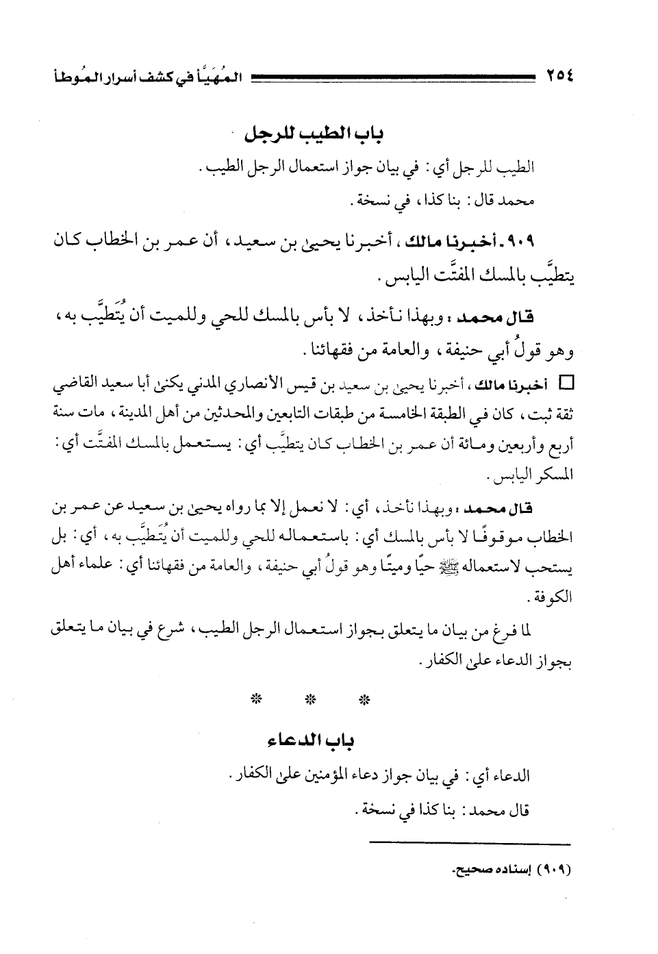 • أخبرنا مالك، أخبرنا يحيى بن سعيد بن قيس الأنصاري المدني يكنى أبا سعيد القاضي ثقة ثبت، كان في الطبقة الخامسة من طبقات التابعين والمحدثين من أهل المدينة، مات سنة أربع وأربعين ومائة أن عمر بن الخطاب كان يتطيَّب أي: يستعمل بالمسك المفتَّت أي: المسكر اليابس.