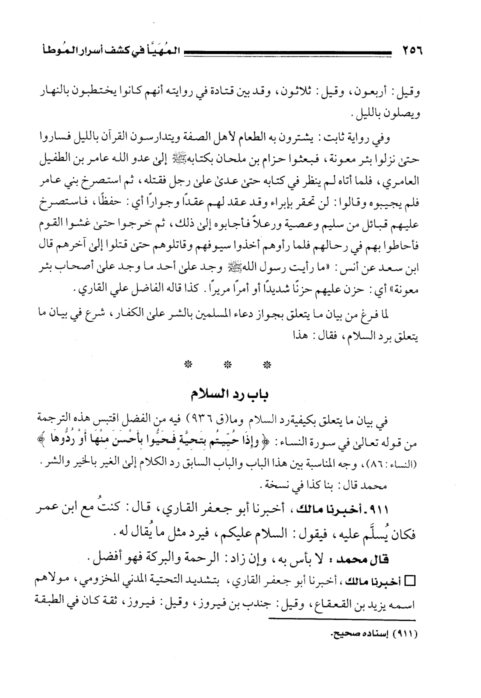 911 - أخبرنا مالك، أخبرنا أبو جعفر القاري، قال: كنتُ مع ابن عمر فكان يُسلَّم عليه، فيقول: السلام عليكم، فيرد مثل ما يُقال له.