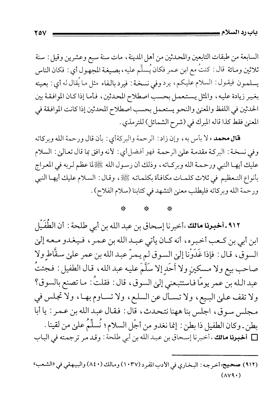 912 - أخبرنا مالك، أخبرنا إسحاق بن عبد الله بن أبي طلحة: أن الطُفَيْل بن أبي بن كعب أخبره، أنه كان يأتي عبد الله بن عمر، فيغدو معه إلى السوق، قال: فإذا غَدَوْنا إلى السوق لم يمرّ عبد الله بن عمر على سقَّاطٍ ولا صاحب بيع ولا مسكينٍ ولا أَحَدٍ إلا سَلَّمَ عليه عبد الله، قال الطفيل: فجئتُ عبد الله بن عمر يومًا فاستتبعني إلى السوق، قال: فقلتُ: ما تصنع بالسوق؟ ولا تقف على البيع، ولا تسأل عن السلع، ولا تساوم بها، ولا تجلس في مجلس سوق، اجلس بنا ههنا نتحدث، قال: فقال عبد الله بن عمر: يا أبا بطن - وكان الطفيل ذا بطن: إنما نغدو من أجْل السلام؛ نُسلِّمُ على من لقينا.