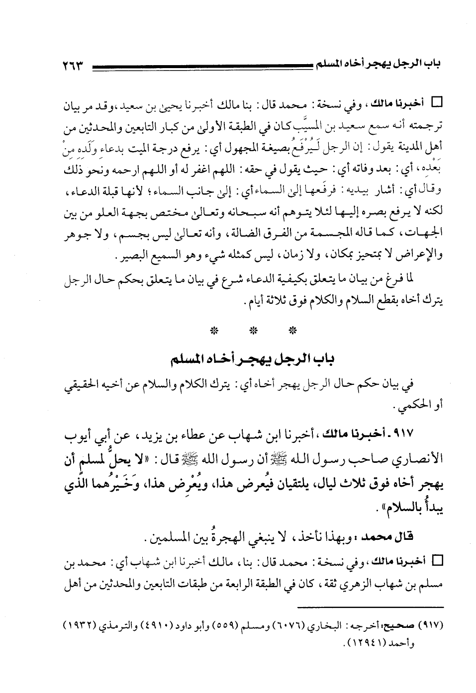 917 - أخبرنا مالك، أخبرنا ابن شهاب عن عطاء بن يزيد، عن أبي أيوب الأنصاري صاحب رسول الله - صلى الله عليه وسلم - أن رسول الله - صلى الله عليه وسلم - قال: "لا يحلُّ لمسلم أن يهجر أخاه فوق ثلاث ليال، يلتقيان فيُعرض هذا، ويُعْرِض هذا، وَخَيْرُهما الذي يبدأُ بالسلام".