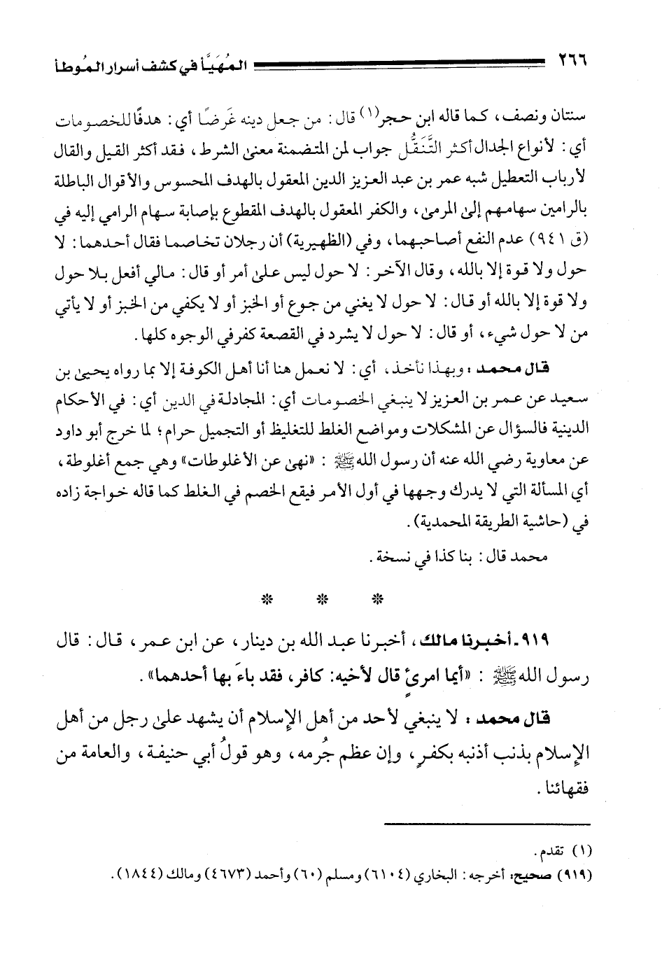 919 - أخبرنا مالك، أخبرنا عبد الله بن دينار، عن ابن عمر، قال: قال رسول الله - صلى الله عليه وسلم -: "أيما امرئٍ قال لأخيه: كافر، فقد باءَ بها أحدهما".