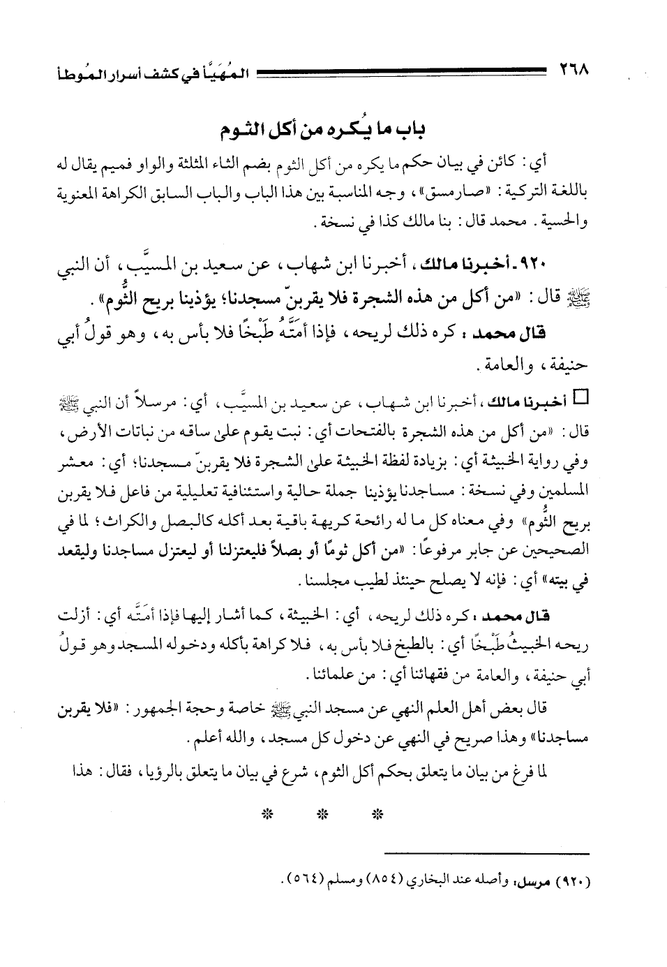 920 - أخبرنا مالك، أخبرنا ابن شهاب، عن سعيد بن المسيَّب، أن النبي - صلى الله عليه وسلم - قال: "من أكل من هذه الشجرة فلا يقربنّ مسجدنا؛ يؤذينا بريح الثُّوم".