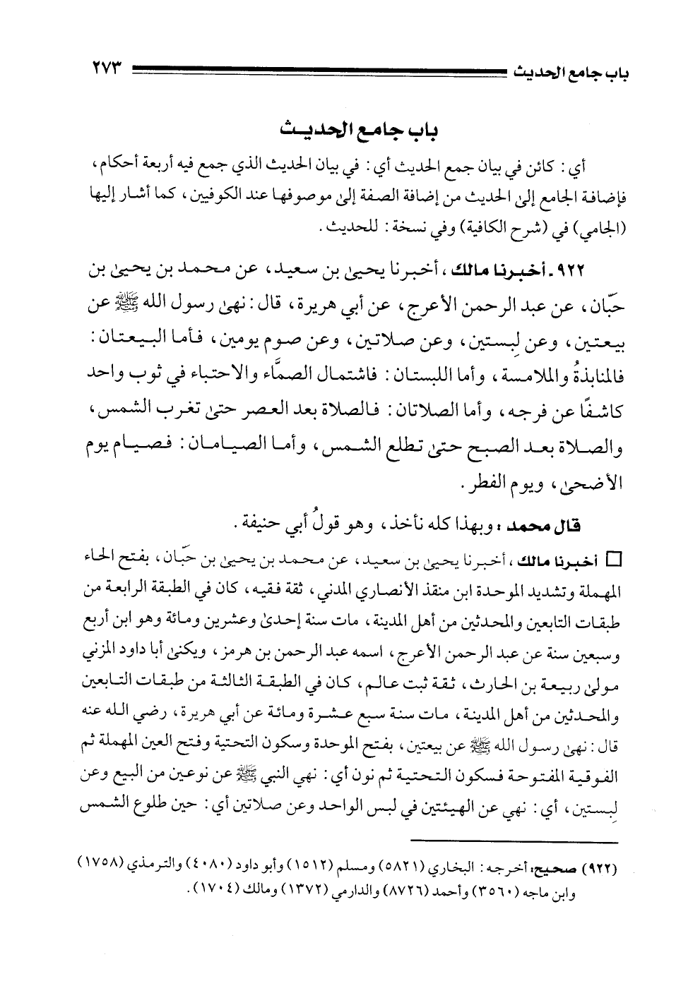 • أخبرنا مالك، أخبرنا يحيى بن سعيد، عن محمد بن يحيى بن حَبّان، بفتح الحاء المهملة وتشديد الموحدة ابن منقذ الأنصاري المدني، ثقة فقيه، كان في الطبقة الرابعة من طبقات التابعين والمحدثين من أهل المدينة، مات سنة إحدى وعشرين ومائة وهو ابن أربع وسبعين سنة عن عبد الرحمن الأعرج، اسمه عبد الرحمن بن هرمز، ويكنى أبا داود المزني مولى ربيعة بن الحارث، ثقة ثبت عالم، كان في الطبقة الثالثة من طبقات التابعين والمحدثين من أهل المدينة، مات سنة سبع عشرة ومائة عن أبي هريرة، رضي الله عنه قال: نهى رسول الله - صلى الله عليه وسلم - عن بيعتين، بفتح الموحدة وسكون التحتية وفتح العين المهملة ثم الفوقية المفتوحة فسكون التحتية ثم نون أي: نهي النبي - صلى الله عليه وسلم - عن نوعين من البيع وعن لِبستين، أي: نهي عن الهيئتين في لبس الواحد وعن صلاتين أي: حين طلوع الشمس