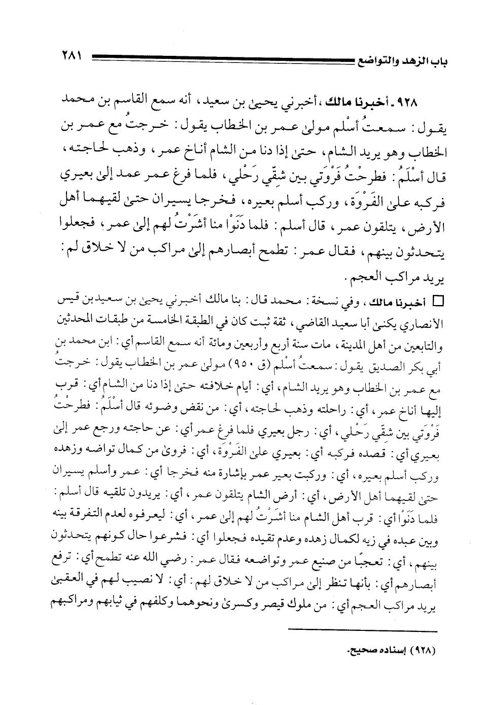 928 - أخبرنا مالك، أخبرني يحيى بن سعيد، أنه سمع القاسم بن محمد يقول: سمعتُ أسْلم مولى عمر بن الخطاب يقول: خرجتُ مع عمر بن الخطاب وهم يريد الشام، حتى إذا دنا من الشام أناخ عمر، وذهب لحاجته، قال أسْلَمُ: فطرحْتُ فَرْوَتي بين شِقّي رَحْلي، فلما فرغ عمر عمد إلى بعيري فركبه على الفَرْوَة، وركب أسلم بعيره، فخرجا يسيران حتى لقيهما أهل الأرض، يتلقون عمر، قال أسلم: فلما دَنَوْا منا أشَرْتُ لهم إلى عمر، فجعلوا يتحدثون بينهم، فقال عمر: تطمح أبصارهم إلى مراكب من لا خلاق لم: يريد مراكب العجم.