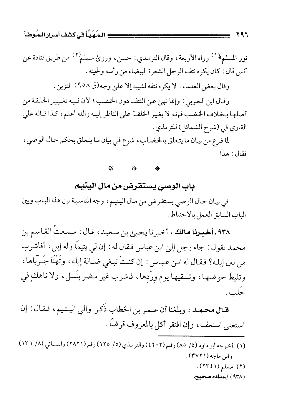 938 - أخبرنا مالك, أخبرنا يحيى بن سعيد، قال: سمعتُ القاسم بن محمد يقول: جاء رجل إلى ابن عباس فقال له: إن لي يتيمًا وله إبل، أفأشرب من لبن إبله؟ فقال له ابن عباس: إن كنتَ تبغي ضالة إبله، وتَهْنَأ جَرْبَاها، وتليط حوضها، وتسقيها يوم وِرْدِها، فاشرب غير مضر بنَسل، ولا ناهكٍ في حَلب.