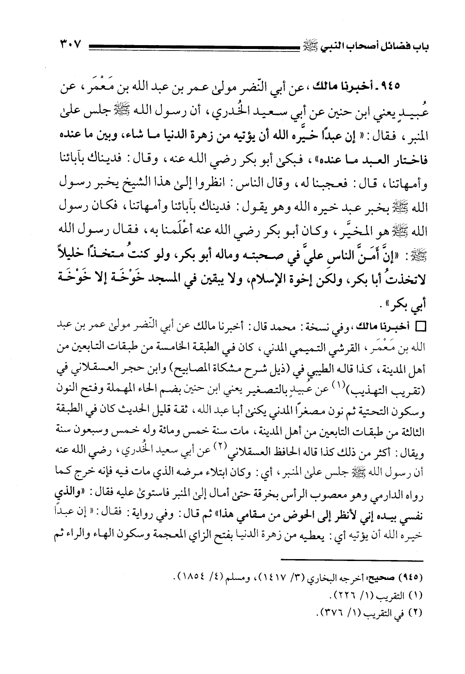945 - أخبرنا مالك، عن أبي النّضر مولى عمر بن عبد الله بن مَعْمَر، عن عُبيدٍ يعني ابن حنين عن أبي سعيد الخُدري، أن رسول الله - صلى الله عليه وسلم - جلس على المنبر، فقال: "إن عبدًا خيَّره الله أن يؤتيه من زهرة الدنيا ما شاء، وبين ما عنده فاختار العبد ما عنده"، فبكى أبو بكر رضي الله عنه، وقال: فديناك بآبائنا وأمهاتنا، قال: فعجبنا له، وقال الناس: انظروا إلى هذا الشيخ يخبر رسول الله - صلى الله عليه وسلم - بخبر عبد خيره الله وهو يقول: فديناك بآبائنا وأمهاتنا، فكان رسول الله - صلى الله عليه وسلم - هو المخيَّر، وكان أبو بكر رضي الله عنه أعْلَمنا به، فقال رسول الله - صلى الله عليه وسلم -: "إنَّ أمَنَّ الناسِ عليَّ في صحبته وماله أبو بكر، ولو كنتُ متخذًا خليلًا لاتخذتُ أبا بكر، ولكن إخوة الإسلام، ولا يبقين في المسجد خَوْخَة إلا خَوْخَة أبي بكر".