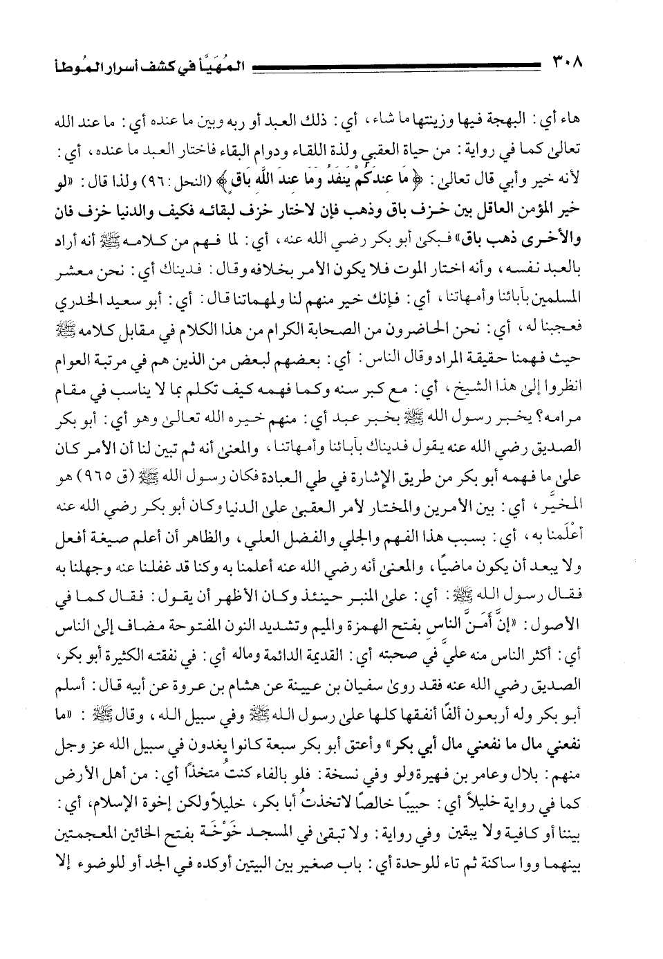 هاء أي: البهجة فيها وزينتها ما شاء، أي: ذلك العبد أو ربه وبين ما عنده أي: ما عند الله تعالى كما في رواية: من حياة العقبي ولذة اللقاء ودوام البقاء فاختار العبد ما عنده، أي: لأنه خير وأبي قال تعالى: {مَا عِنْدَكُمْ يَنْفَدُ وَمَا عِنْدَ اللَّهِ بَاقٍ} [النحل: 96] ولذا قال: "لو خير المؤمن العاقل بين خزف باق وذهب فإن لاختار خزف لبقائه فكيف والدنيا خزف فان والأخرى ذهب باق" فبكى أبو بكر رضي الله عنه، أي: لما فهم من كلامه - صلى الله عليه وسلم - أنه أراد بالعبد نفسه، وأنه اختار الموت فلا يكون الأمر بخلافه وقال: فديناك أي: نحن معشر المسلمين بآبائنا وأمهاتنا، أي: فإنك خير منهم لنا ولمهماتنا قال: أي: أبو سعيد الخدري فعجبنا له، أي: نحن الحاضرون من الصحابة الكرام من هذا الكلام في مقابل كلامه - صلى الله عليه وسلم - حيث فهمنا حقيقة المراد وقال الناس: أي: بعضهم لبعض من الذين هم في مرتبة العوام انظروا إلى هذا الشيخ، أي: مع كبر سنه وكما فهمه كيف تكلم بما لا يناسب في مقام مرامه؟ يخبر رسول الله - صلى الله عليه وسلم - بخبر عبد أي: منهم خيره الله تعالى وهو أي: أبو بكر الصديق رضي الله عنه يقول فديناك بآبائنا وأمهاتنا، والمعنى أنه ثم تبين لنا أن الأمر كان على ما فهمه أبو بكر من طريق الإِشارة في طي العبادة فكان رسول الله - صلى الله عليه وسلم - (ق 965) هو المخيَّر، أي: بين الأمرين والمختار لأمر العقبى على الدنيا وكان أبو بكر رضي الله عنه أعْلَمنا به، أي: بسبب هذا الفهم والجلي والفضل العلي، والظاهر أن أعلم صيغة أفعل ولا يبعد أن يكون ماضيًا، والمعنى أنه رضي الله عنه أعلمنا به وكنا قد غفلنا عنه وجهلنا به فقال رسول الله - صلى الله عليه وسلم -: أي: على المنبر حينئذ وكان الأظهر أن يقول: فقال كما في الأصول: "إنَّ أَمَنَّ الناسِ بفتح الهمزة والميم وتشديد النون المفتوحة مضاف إلى الناس أي: أكثر الناس منه عليَّ في صحبته أي: القديمة الدائمة وماله أي: في نفقته الكثيرة أبو بكر، الصديق رضي الله عنه فقد روى سفيان بن عيينة عن هشام بن عروة عن أبيه قال: أسلم أبو بكر وله أربعون ألفًا أنفقها كلها على رسول الله - صلى الله عليه وسلم - وفي سبيل الله، وقال - صلى الله عليه وسلم -: "ما نفعني مال ما نفعني مال أبي بكر" وأعتق أبو بكر سبعة كانوا يغدون في سبيل الله عز وجل منهم: بلال وعامر بن فهيرة ولو وفي نسخة: فلو بالفاء كنتُ متخذًا أي: من أهل الأرض كما في رواية خليلًا أي: حبيبًا خالصًا لاتخذتُ أبا بكر، خليلًا ولكن إخوة الإسلام، أي: بيننا أو كافية ولا يبقين وفي رواية: ولا تبقى في المسجد خَوْخَة بفتح الخائين المعجمتين بينهما واو ساكنة ثم تاء للوحدة أي: باب صغير بين البيتين أوكده في الجد أو للوضوء إلا
