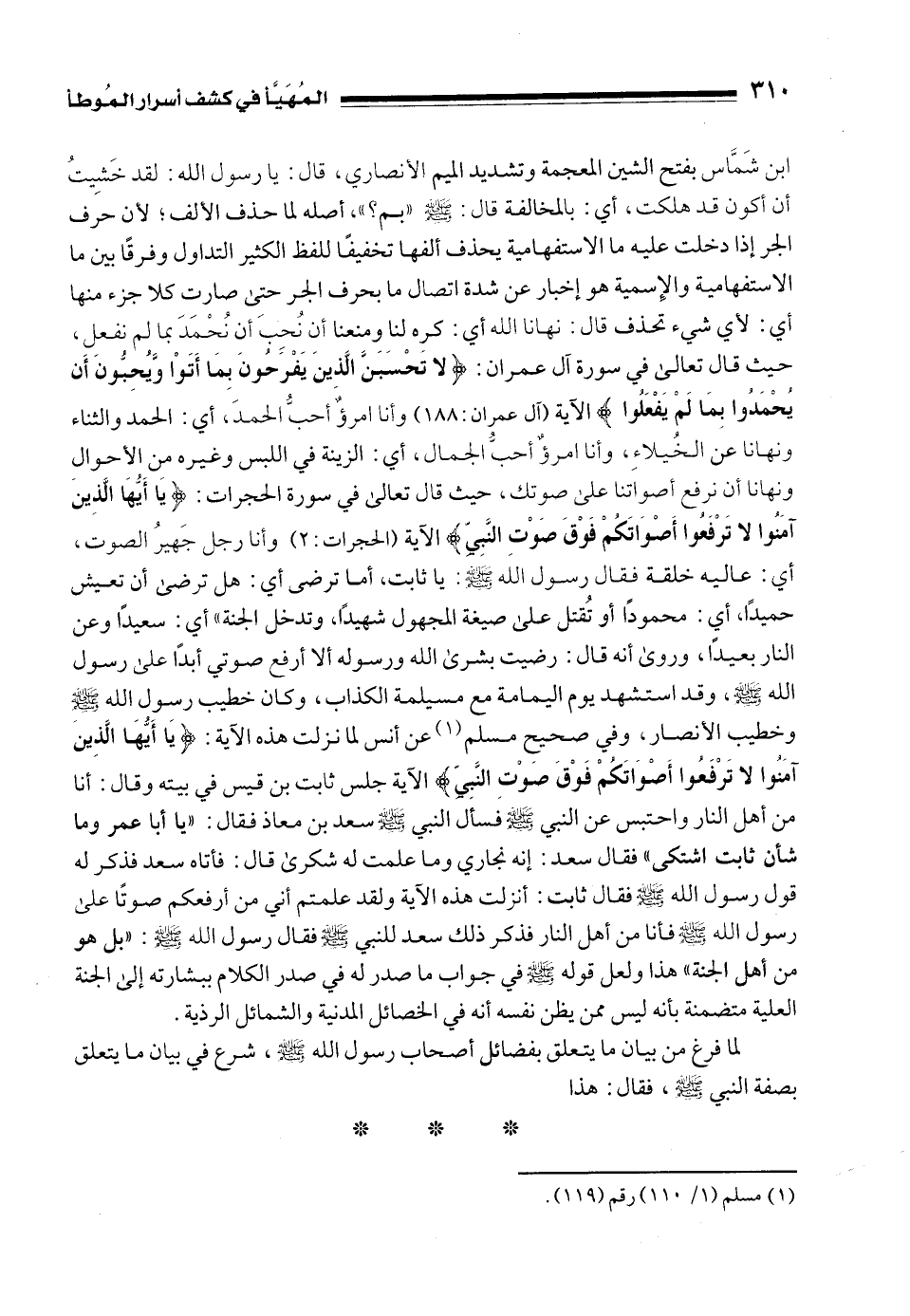 ابن شَمَّاس بفتح الشين المعجمة وتشديد الميم الأنصاري، قال: يا رسول الله: لقد خَشِيتُ أن أكون قد هلكت، أي: بالمخالفة قال: - صلى الله عليه وسلم - "بم؟ "، أصله لما حذف الألف؛ لأن حرف الجر إذا دخلت عليه ما الاستفهامية يحذف ألفها تخفيفًا للفظ الكثير التداول وفرقًا بين ما الاستفهامية والإِسمية هو إخبار عن شدة اتصال ما بحرف الجر حتى صارت كلا جزء منها أي: لأي شيء تحذف قال: نهانا الله أي: كره لنا ومنعنا أن نُحِبَ أن نُحْمَدَ بما لم نفعل، حيث قال تعالى في سورة آل عمران: {لَا تَحْسَبَنَّ الَّذِينَ يَفْرَحُونَ بِمَا أَتَوْا وَيُحِبُّونَ أَنْ يُحْمَدُوا بِمَا لَمْ يَفْعَلُوا} الآية [آل عمران: 188] وأنا امرؤٌ أحبُّ الحمدَ، أي: الحمد والثناء ونهانا عن الخُيلاءِ، وأنا امرؤٌ أحبُّ الجمال، أي: الزينة في اللبس وغيره من الأحوال ونهانا أن نرفع أصواتنا على صوتك، حيث قال تعالى في سورة الحجرات: {يَاأَيُّهَا الَّذِينَ آمَنُوا لَا تَرْفَعُوا أَصْوَاتَكُمْ فَوْقَ صَوْتِ النَّبِيِّ} الآية [الحجرات: 2] وأنا رجل جَهيرُ الصوت، أي: عاليه خلقة فقال رسول الله - صلى الله عليه وسلم -: يا ثابت، أما ترضى أي: هل ترضى أن تعيش حميدًا، أي: محمودًا أو تُقتل على صيغة المجهول شهيدًا، وتدخل الجنة" أي: سعيدًا وعن النار بعيدًا، وروى أنه قال: رضيت بشرى الله ورسوله ألا أرفع صوتي أبدًا على رسول الله - صلى الله عليه وسلم -، وقد استشهد يوم اليمامة مع مسيلمة الكذاب، وكان خطيب رسول الله - صلى الله عليه وسلم - وخطيب الأنصار، وفي صحيح مسلم (¬1) عن أنس لما نزلت هذه الآية: {يَاأَيُّهَا الَّذِينَ آمَنُوا لَا تَرْفَعُوا أَصْوَاتَكُمْ فَوْقَ صَوْتِ النَّبِيِّ} الآية جلس ثابت بن قيس في بيته وقال: أنا من أهل النار واحتبس عن النبي - صلى الله عليه وسلم - فسأل النبي - صلى الله عليه وسلم - سعد بن معاذ فقال: "يا أبا عمر وما شأن ثابت اشتكى" فقال سعد: إنه نجاري وما علمت له شكرى قال: فأتاه سعد فذكر له قول رسول الله - صلى الله عليه وسلم - فقال ثابت: أنزلت هذه الآية ولقد علمتم أني من أرفعكم صوتًا على رسول الله - صلى الله عليه وسلم - فأنا من أهل النار فذكر ذلك سعد للنبي - صلى الله عليه وسلم - فقال رسول الله - صلى الله عليه وسلم -: "بل هو من أهل الجنة" هذا ولعل قوله - صلى الله عليه وسلم - في جواب ما صدر له في صدر الكلام ببشارته إلى الجنة العلية متضمنة بأنه ليس ممن يظن نفسه أنه في الخصائل المدنية والشمائل الرذية.