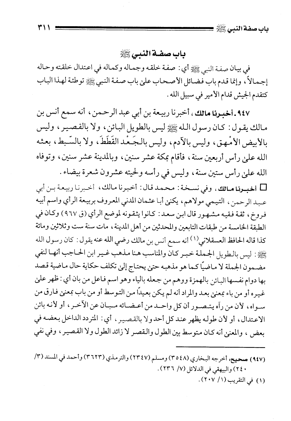 947 - أخبرنا مالك، أخبرنا ربيعة بن أبي عبد الرحمن، أنه سمع أنس بن مالك يقول: كان رسول الله - صلى الله عليه وسلم - ليس بالطويل البائن، ولا بالقصير، وليس بالأبيض الأمْهق، وليس بالآدم، وليس بالجَعْد القَطَطَ، ولا بالسّبط، بعثه الله على رأس أربعين سنة، فأقام بمكة عشر سنين، وبالمدينة عشر سنين، وتوفاه الله على رأس ستين سنة، وليس في رأسه ولحيته عشرون شعرة بيضاء.