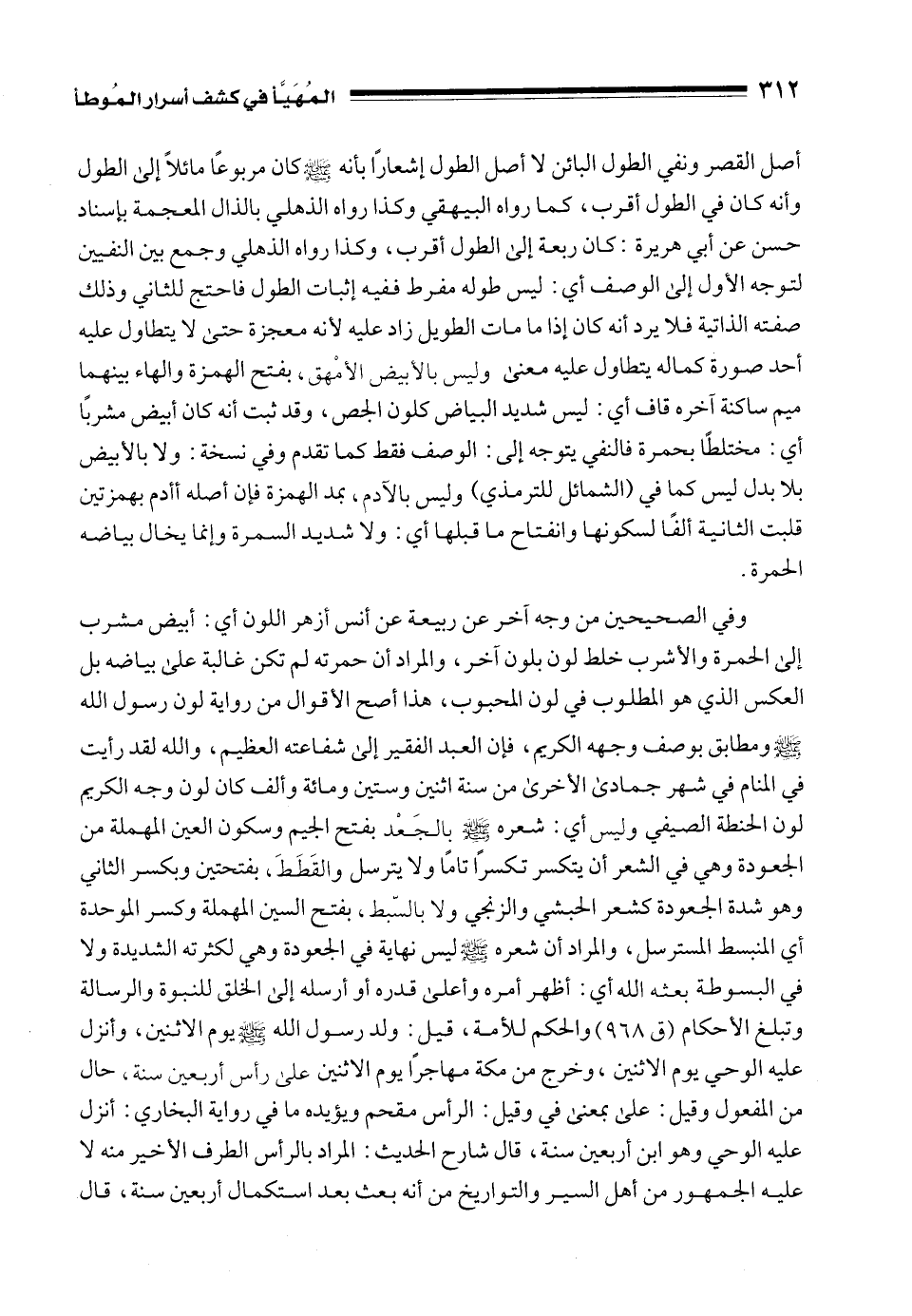 وفي الصحيحين من وجه آخر عن ربيعة عن أنس أزهر اللون أي: أبيض مشرب إلى الحمرة والأشرب خلط لون بلون آخر، والمراد أن حمرته لم تكن غالبة على بياضه بل العكس الذي هو المطلوب في لون المحبوب، هذا أصح الأقوال من رواية لون رسول الله - صلى الله عليه وسلم - ومطابق بوصف وجهه الكريم، فإن العبد الفقير إلى شفاعته العظيم، والله لقد رأيت في المنام في شهر جمادى الأخرى من سنة اثنين وستين ومائة وألف كان لون وجهه الكريم لون الحنطة الصيفي وليس أي: شعره - صلى الله عليه وسلم - بالجَعْد بفتح الجيم وسكون العين المهملة من الجعودة وهي في الشعر أن يتكسر تكسرًا تامًا ولا يترسل والقَطَطَ، بفتحتين وبكسر الثاني وهو شدة الجعودة كشعر الحبشي والزنجي ولا بالسَّبط، بفتح السين المهملة وكسر الموحدة أي المنبسط المسترسل، والمراد أن شعره - صلى الله عليه وسلم - ليس نهاية في الجعودة وهي لكثرته الشديدة ولا في البسوطة بعثه الله أي: أظهر أمره وأعلى قدره أو أرسله إلى الخلق للنبوة والرسالة وتبلغ الأحكام (ق 968) والحكم للأمة، قيل: ولد رسول الله - صلى الله عليه وسلم - يوم الاثنين، وأنزل عليه الوحي يوم الاثنين، وخرج من مكة مهاجرًا يوم الاثنين على رأس أربعين سنة، حال من المفعول وقيل: على بمعنى في وقيل: الرأس مقحم ويؤيده ما في رواية البخاري: أنزل عليه الوحي وهو ابن أربعين سنة، قال شارح الحديث: المراد بالرأس الطرف الأخير منه لا عليه الجمهور من أهل السير والتواريخ من أنه بعث بعد استكمال أربعين سنة، قال