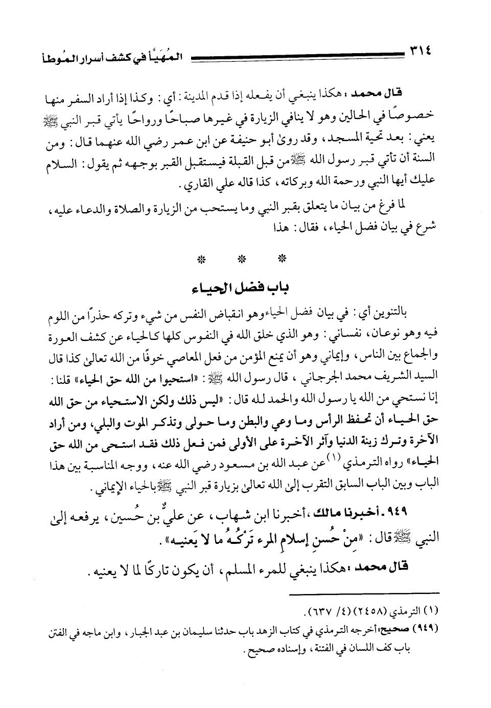 لما فرغ من بيان ما يتعلق بقبر النبي وما يستحب من الزيارة والصلاة والدعاء عليه، شرع في بيان فضل الحياء، فقال: هذا