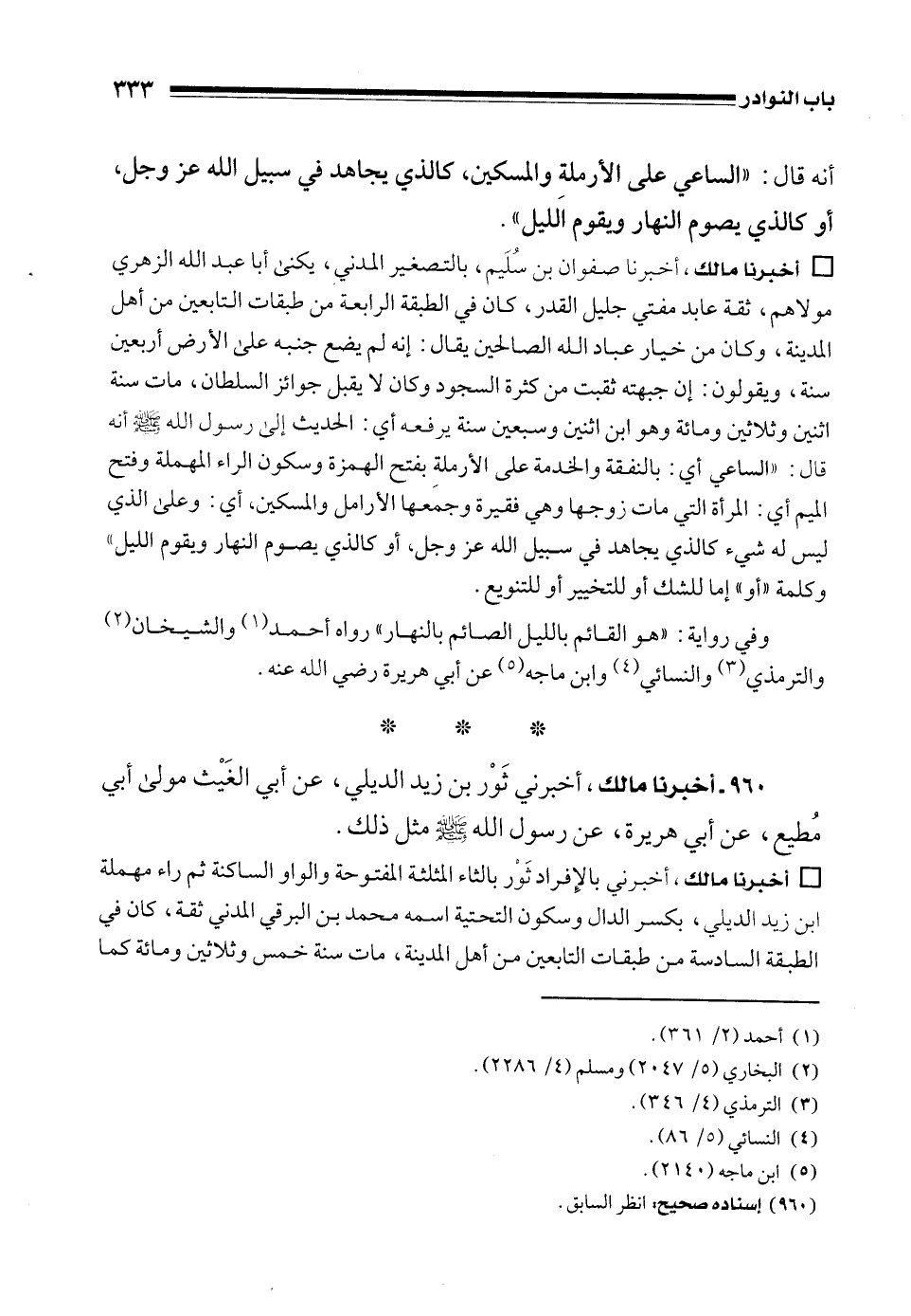 • أخبرنا مالك، أخبرنا صفوان بن سُلَيم، بالتصغير المدني، يكنى أبا عبد الله الزهري مولاهم، ثقة عابد مفتي جليل القدر، كان في الطبقة الرابعة من طبقات التابعين من أهل المدينة، وكان من خيار عباد الله الصالحين يقال: إنه لم يضع جنبه على الأرض أربعين سنة، ويقولون: إن جبهته ثقبت من كثرة السجود وكان لا يقبل جوائز السلطان، مات سنة اثنين وثلاثين ومائة وهو ابن اثنين وسبعين سنة يرفعه أي: الحديث إلى رسول الله - صلى الله عليه وسلم - أنه قال: "الساعي أي: بالنفقة والخدمة على الأرملة بفتح الهمزة وسكون الراء المهملة وفتح الميم أي: المرأة التي مات زوجها وهي فقيرة وجمعها الأرامل والمسكين، أي: وعلى الذي ليس له شيء الذي يجاهد في سبيل الله عز وجل، أو كالذي يصوم النهار ويقوم الليل" وكلمة "أو" إما للشك أو للتخيير أو للتنويع.