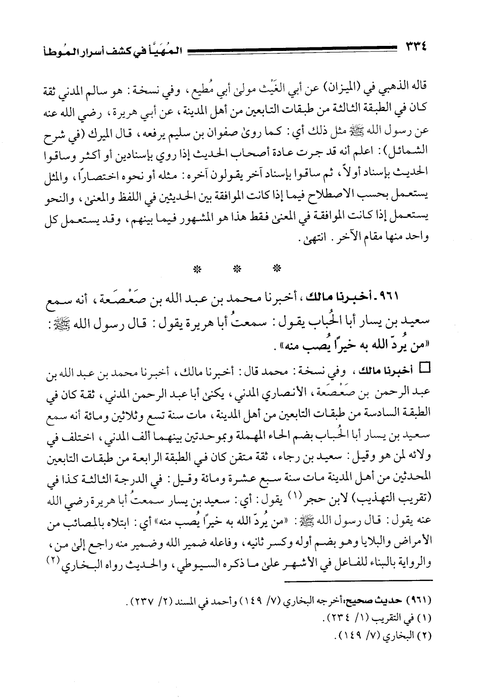 961 - أخبرنا مالك، أخبرنا محمد بن عبد الله بن صَعْصَعة، أنه سمع سعيد بن يسار أبا الحُباب يقول: سمعتُ أبا هريرة يقول: قال رسول الله - صلى الله عليه وسلم -: "من يُردّ الله به خيرًا يُصب منه".