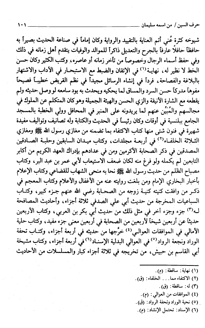 شُيُوخه كَثْرَة عني أتم الْعِنَايَة بالتقييد وَالرِّوَايَة وَكَانَ إِمَامًا فِي صناعَة الحَدِيث بَصيرًا بِهِ حَافِظًا حافلا عَارِفًا بِالْجرْحِ وَالتَّعْدِيل ذَاكِرًا للموالد والوفيات يتَقَدَّم أهل زَمَانه فِي ذَلِك وَفِي حفظ أَسمَاء الرِّجَال وخصوصا من تَأَخّر زَمَانه أَو عاصره وَكتب الْكثير وَكَانَ حسن الْخط لَا نَظِير لَهُ نِهَايَة فِي الإتقان والضبط مَعَ الاستبحار فِي الْآدَاب والاشتهار بالبلاغة والفصاحة فَردا فِي إنْشَاء الرسائل مجيدا فِي نظم القريض خَطِيبًا فصيحا مفوها مدْركا حسن السرد والمساق لما يحكيه وَيحدث بِهِ وَيَوَد سامعه لَو وصل حَدِيثه وَلم يقطعهُ مَعَ الشارة الأنيقة والزي الْحسن والهيئة الجميلة وَهُوَ كَانَ الْمُتَكَلّم عَن الْمُلُوك فِي مجَالِسهمْ والمبين عَنْهُم لما يريدونه على الْمِنْبَر فِي المحافل وَولي الْخطْبَة بِالْمَسْجِدِ الْجَامِع ببلنسية فِي أَوْقَات وَكَانَ رَئِيسا فِي الحَدِيث وَالْكِتَابَة وَله تصانيف وتواليف مفيدة شهيرة فِي فنون شَتَّى مِنْهَا كتاب الِاكْتِفَاء بِمَا تضمنه من مغازي رَسُول الله صَلَّى اللَّهُ عَلَيْهِ وَسلم وَمَغَازِي الثَّلَاثَة الْخُلَفَاء فِي أَرْبَعَة مجلدات وَكتاب ميدان السَّابِقين وحلبة الصَّادِقين المصدقين فِي ذكر الصَّحَابَة الأكرمين وَمن فِي عدادهم بِإِدْرَاك الْعَهْد الْكَرِيم من أكَابِر التَّابِعين لم يكمله وَلَو فرغ مِنْهُ لَكَانَ ضعف الِاسْتِيعَاب لأبي عمر بن عبد الْبر وَكتاب مِصْبَاح الظُّلم من حَدِيث رَسُول الله صَلَّى اللَّهُ عَلَيْهِ وَسَلَّمَ نحا بِهِ منحى الشهَاب للقضاعي وَكتاب الْإِعْلَام بأخبار البُخَارِيّ الإِمَام وَمن بلغت رِوَايَته عَنهُ من الأغفال والأعلام وَكتاب المعجم فِي ذكر من وَافَقت كنيته كنية زوجه من الصَّحَابَة رَضِي الله عَنْهُم جُزْء كَبِير وَكتاب السباعيات المخرجة من حَدِيث أبي عَليّ الصَّدَفِي ثَلَاثَة أَجزَاء وَأَحَادِيث المصافحة لَهُ جُزْء وجزء آخر فِي مثل ذَلِك من حَدِيث أبي بكر بن الْعَرَبِيّ وَكتاب الْأَرْبَعين حَدِيثا عَن أَرْبَعِينَ شَيخا لأربعين من الصَّحَابَة فِي أَرْبَعِينَ معنى جُزْء مُفِيد وَكتاب حلية الأمالي فِي الموافقات العوالي خرجها من حَدِيثه فِي أَرْبَعَة أَجزَاء وَكتاب تحفة الوراد ونجعة الرواد فِي العوالي الْبَدَلِيَّة الْإِسْنَاد فِي أَرْبَعَة أَجزَاء وَكتاب مشيخة أبي الْقَاسِم بن حُبَيْش من تَخْرِيجه فِي ثَلَاثَة أَجزَاء كبار والمسلسلات من الْأَحَادِيث