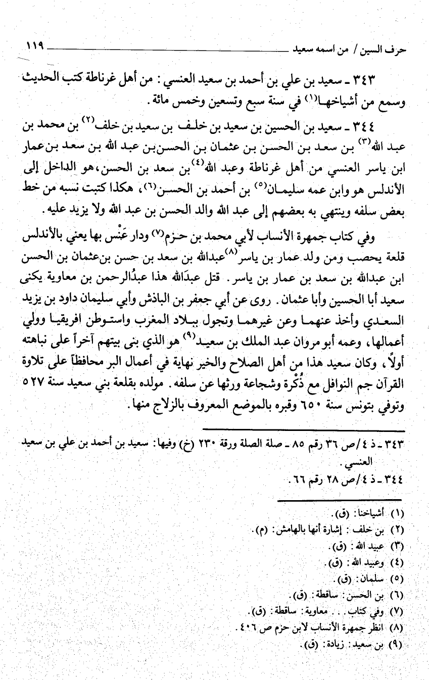 344 - سعيد بن الْحُسَيْن بْن سَعِيد بْن خَلَف بْن سعيد بن خلف بن مُحَمَّد بْن عَبْد اللَّه بْن سَعْد بن الْحسن بن عُثْمَان بن الْحَسَن بْن عَبْد اللَّه بْن سعد بن عمار ابْن يَاسر الْعَنسِي من أهل غرناطة وَعبد الله بن سعد بن الْحسن هُوَ الدَّاخِل إِلَى الأندلس هُوَ وَابْن عَمه سُلَيْمَان بن أَحْمد بن الْحسن هَكَذَا كتبت نسبه من خطّ بعض سلفه وَيَنْتَهِي بِهِ بَعضهم إِلَى عبد الله وَالِد الْحسن بن عبد الله وَلَا يزِيد عَلَيْهِ