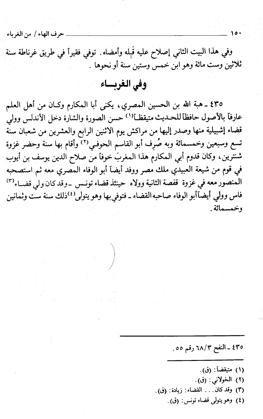 435 - هبة الله بن الْحُسَيْن الْمصْرِيّ يكنى أَبَا المكارم وَكَانَ من أهل الْعلم عَارِفًا بالأصول حَافِظًا للْحَدِيث متيقظا حسن الصُّورَة والشارة دخل الأندلس وَولي قَضَاء إشبيلية مِنْهَا وَصدر إِلَيْهَا من مراكش يَوْم الِاثْنَيْنِ الرَّابِع وَالْعِشْرين من شعْبَان سنة تسع وَسبعين وَخَمْسمِائة وَبِه صرف أَبُو الْقَاسِم الحوفي وَأقَام بهَا سنة وَحضر غَزْوَة شنترين وَكَانَ قدوم أبي المكارم هَذَا الْمغرب خوفًا من صَلَاح الدّين يُوسُف بن أَيُّوب فِي قوم من شيعَة العبيدي ملك مصر ووفد أَيْضا أَبُو الْوَفَاء الْمصْرِيّ مَعَه ثمَّ استصحبه الْمَنْصُور مَعَه فِي غَزْوَة قفصة الثَّانِيَة وولاه حِينَئِذٍ قَضَاء تونس وَقد كَانَ ولي قَضَاء فاس وَولي أَيْضا أَبُو الْوَفَاء صَاحبه الْقَضَاء فَتوفي بهَا وَهُوَ يتَوَلَّى ذَلِك سنة سِتّ وَثَمَانِينَ وَخَمْسمِائة