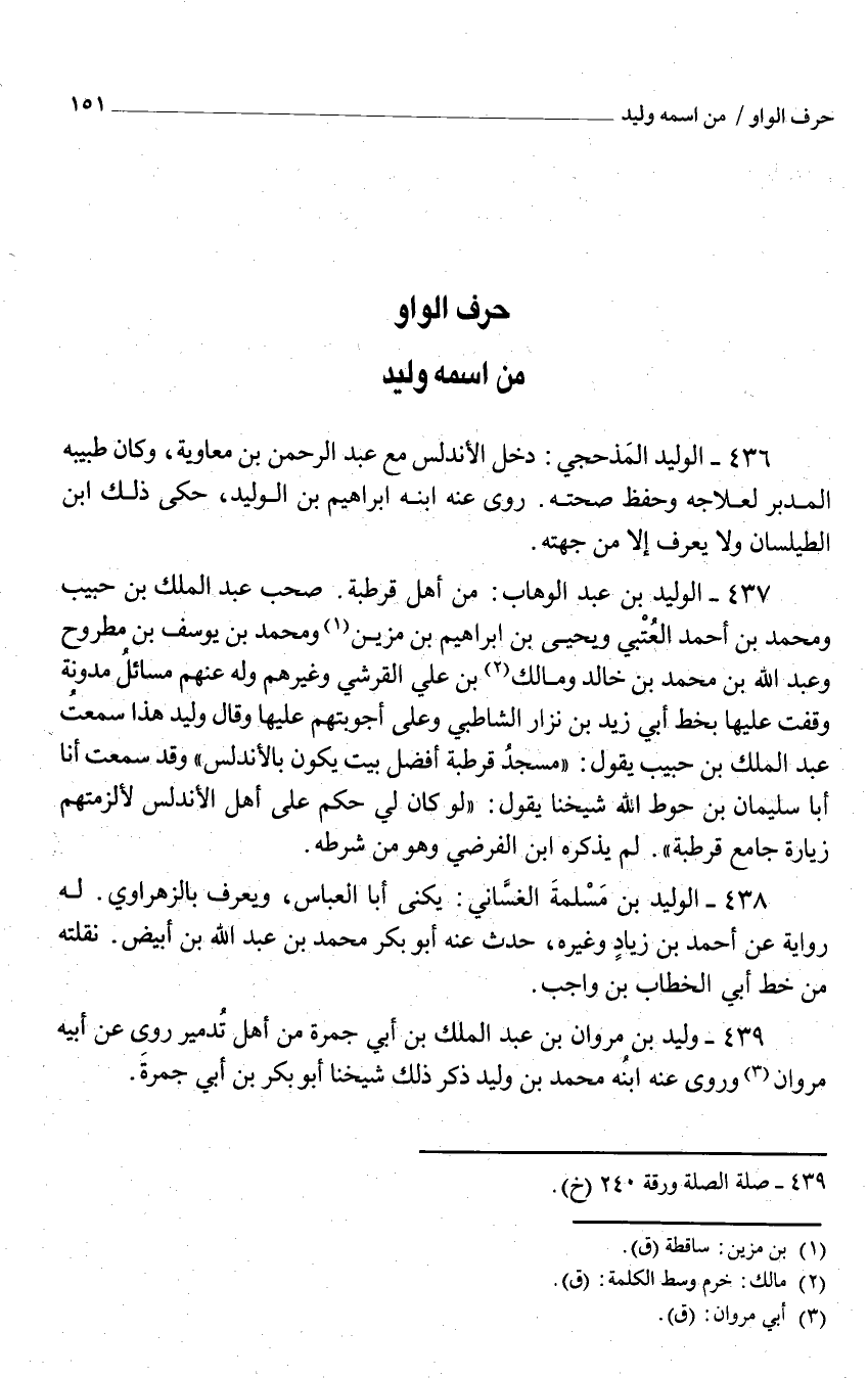 من أهل قرطبة صحب عبد الْملك بن حبيب وَمُحَمّد بن أَحْمد الْعُتْبِي وَيحيى بن إِبْرَاهِيم بن مزين وَمُحَمّد بن يُوسُف بن مطروح وَعبد الله بن مُحَمَّد بن خَالِد وَمَالك بن عَليّ الْقرشِي وَغَيرهم وَله عَنْهُم مسَائِل مدونة وقفت عَلَيْهَا بِخَط أبي زيد بن نزار الشاطبي وعَلى أجوبتهم عَلَيْهَا وَقَالَ وليد هَذَا سَمِعت عبد الْملك بن حبيب يَقُول مَسْجِد قرطبة أفضل بَيت يكون بالأندلس وَقد سَمِعت أَنا أَبَا سُلَيْمَان بن حوط الله شَيخنَا يَقُول لَو كَانَ لي حكم على أهل الأندلس لألزمتهم زِيَارَة جَامع قرطبة لم يذكرهُ ابْنُ الفرضي وَهُوَ من شَرطه