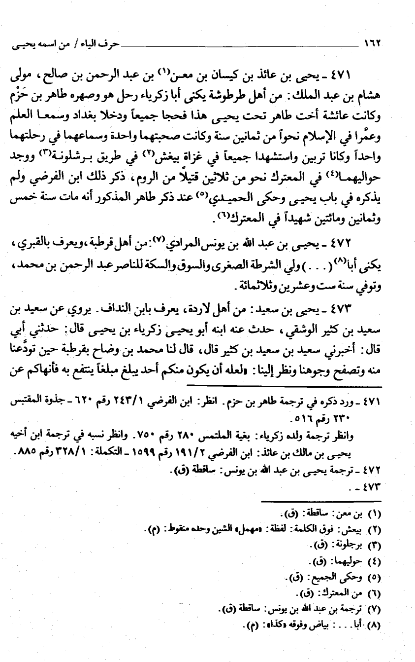 471 - يحيى بْن عَائِذ بْن كيسَان بْن معن بْن عَبْد الرَّحْمَن بْن صَالح مولى هِشَام بْن عبد الْملك من أهل طرطوشة يكنى أَبَا زَكَرِيَّاء رَحل هُوَ وصهره طَاهِر بن حزم وَكَانَت عَائِشَة أُخْت طَاهِر تَحت يحيى هَذَا فحجا جَمِيعًا ودخلا بَغْدَاد وسمعا الْعلم وعمرا فِي الْإِسْلَام نَحوا من ثَمَانِينَ سنة وَكَانَت صحبتهما وَاحِدَة وسماعهما فِي رحلتهما وَاحِدًا وَكَانَا تربين واستشهدا جَمِيعًا فِي غزَاة بيغش فِي طَرِيق برشلونة وَوجد حواليهما فِي المعترك نَحْو من ثَلَاثِينَ قَتِيلا من الرّوم ذكر ذَلِك ابْن الفرضي وَلم يذكرهُ فِي بَاب يحيى وَحكى الْحميدِي عِنْد ذكر طَاهِر الْمَذْكُور أَنه مَاتَ سنة خمس وَثَمَانِينَ وَمِائَتَيْنِ شَهِيدا فِي المعترك