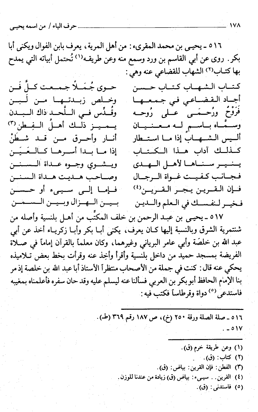 517 - يحيى بن عبد الرَّحْمَن بن خلف الْمكتب من أهل بلنسية وَأَصله من شنتمرية الشرق وبالنسبة إِلَيْهَا كَانَ يعرف يكنى أَبَا بكر وَأَبا زَكَرِيَّاء أَخذ عَنْ أبي عَبْد اللَّه بْن خلصة وَأبي عَامر البرياني وَغَيرهمَا وَكَانَ معلما بِالْقُرْآنِ إِمَامًا فِي صَلَاة الْفَرِيضَة بِمَسْجِد حميد من دَاخل بلنسية وأقرأ وَأخذ عَنهُ وقرأت بِخَط بعض تلاميذه يحْكى عَنهُ قَالَ كنت فِي جملَة من الْأَصْحَاب منتظرا الْأُسْتَاذ أَبَا عبد الله بن خلصة إِذْ مر بِنَا الإِمَام الْحَافِظ أَبُو بكر بن الْعَرَبِيّ فسألنا عَنهُ ليسلم عَلَيْهِ وَقد حَان سَفَره فأعلمناه بمغيبه فاستدعى دَوَاة وقرطاسا فَكتب فِيهِ
