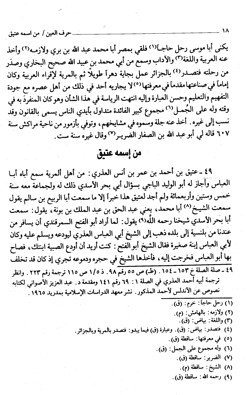 49 - عَتيق بن أَحْمد بْن عُمَر بْن أنس العذري من أَهْل المرية سَمِعَ أَبَاهُ أَبَا الْعَبَّاس وَأَجَازَ لَهُ أَبُو الْوَلِيد الْبَاجِيّ بسؤال أبي بَحر بَحر الْأَسدي ذَلِك لَهُ ولجماعة مَعَه سنة خمس وَسِتِّينَ وَأَرْبَعمِائَة وَلم أجد لعتيق هَذَا خَبرا إِلَّا مَا سَمِعت أَبَا الرّبيع بن سَالم يَقُول سَمِعت الشَّيْخ أَبَا مُحَمَّد يَعْنِي عبد الْحق بْن عَبْد الْملك بْن بُونُه يَقُول سَمِعت أَبَا بَحر الْأَسدي شَيخنَا رَحمَه الله يَقُول لما أَرَادَ أَبُو الْفَتْح السَّمرقَنْدِي أَن يُسَافر من عندنَا من بلنسية إِلَى بَلَده ذهب إِلَى الشَّيْخ أبي الْعَبَّاس العذري ليودعه وَيسلم عَلَيْهِ وَكَانَ لأبي الْعَبَّاس ابْنة صَغِيرَة فَقَالَ الشَّيْخ أَبُو الْفَتْح كنت أُرِيد أَن أودع الصبية ابْنَتك فصاح بهَا أَبُو الْعَبَّاس فَخرجت إِلَيْهِ فَأَخذهَا الشَّيْخ فِي حجره ودموعه تجْرِي إِذْ كَانَ قد تخلف