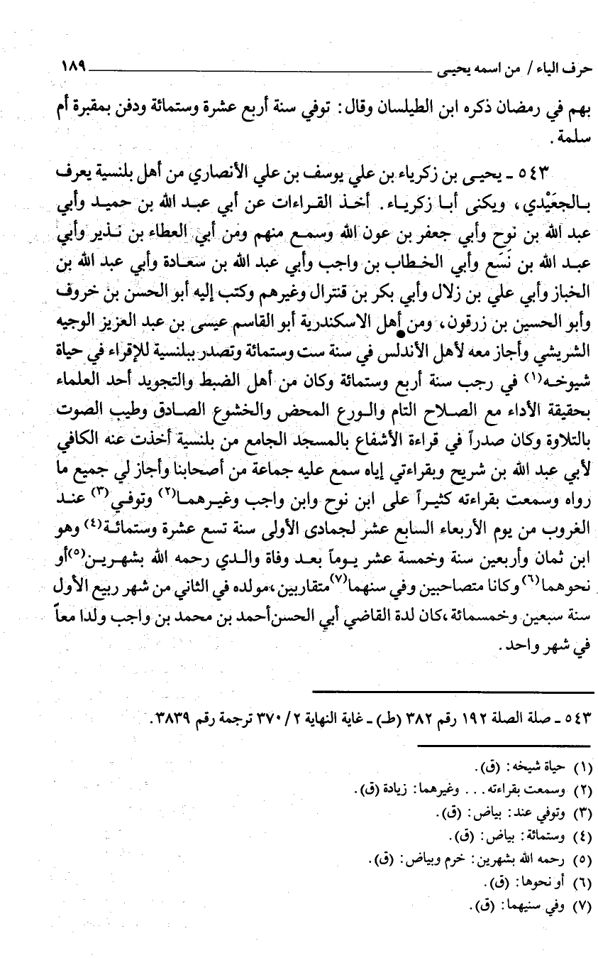 543 - يحيى بن زَكَرِيَّاء بن عَليّ يُوسُف بن عَليّ الْأنْصَارِيّ من أهل بلنسية يعرف بالجعيدي ويكنى أَبَا زَكَرِيَّاء أَخذ الْقرَاءَات عَنْ أبي عَبْد اللَّه بْن حميد وَأبي عبد الله بن نوح وَأبي جَعْفَر بن عون الله وَسمع مِنْهُم وَمن أبي الْعَطاء بْن نَذِير وَأبي عَبْد الله بن نسع وَأبي الْخطاب بْن وَاجِب وَأبي عَبْد اللَّه بْن سَعَادَة وَأبي عَبْد اللَّه بن الخباز وَأبي عَليّ بن زلال وَأبي بكر بن قنترال وَغَيرهم وَكتب إِلَيْهِ أَبُو الْحسن بن خروف وَأَبُو الْحُسَيْن بن زرقون وَمن أهل الْإسْكَنْدَريَّة أَبُو القَاسِم عِيسَى بْن عبد الْعَزِيز الْوَجِيه الشريشي وَأَجَازَ مَعَه لأهل الأندلس فِي سنة سِتّ وسِتمِائَة وتصدر ببلنسية للإقراء فِي حَيَاة شُيُوخه فِي رَجَب سنة أَربع وسِتمِائَة وَكَانَ من أهل الضَّبْط والتجويد أحد الْعلمَاء بِحَقِيقَة الْأَدَاء مَعَ الصّلاح التَّام والورع الْمَحْض والخشوع الصَّادِق وَطيب الصَّوْت بالتلاوة وَكَانَ صَدرا فِي قِرَاءَة الأشفاع بِالْمَسْجِدِ الْجَامِع من بلنسية أخذت عَنهُ الْكَافِي لأبي عبد الله بن شُرَيْح وبقراءتي إِيَّاه سمع عَلَيْهِ جمَاعَة من أَصْحَابنَا وَأَجَازَ لي جَمِيع مَا رَوَاهُ وَسمعت بقرَاءَته كثيرا على ابْن نوح وَابْن وَاجِب وَغَيرهمَا وَتُوفِّي عِنْد الْغُرُوب من يَوْم الْأَرْبَعَاء السَّابِع عشر لجمادي الأولي سنة تسع عشرَة وسِتمِائَة وَهُوَ ابْنُ ثَمَان وَأَرْبَعين سنة وَخَمْسَة عشر يَوْمًا بعد وَفَاة وَالِدي رَحمَه الله بشهرين أَو نَحْوهمَا وَكَانَا متصاحبين وَفِي سنهما متقاربين مولده فِي الثَّانِي من شهر ربيع الأول سنة سبعين وَخَمْسمِائة كَانَ لِدَة القَاضِي أبي الْحسن أَحْمد بن مُحَمَّد بن وَاجِب ولدا مَعًا فِي شهر وَاحِد