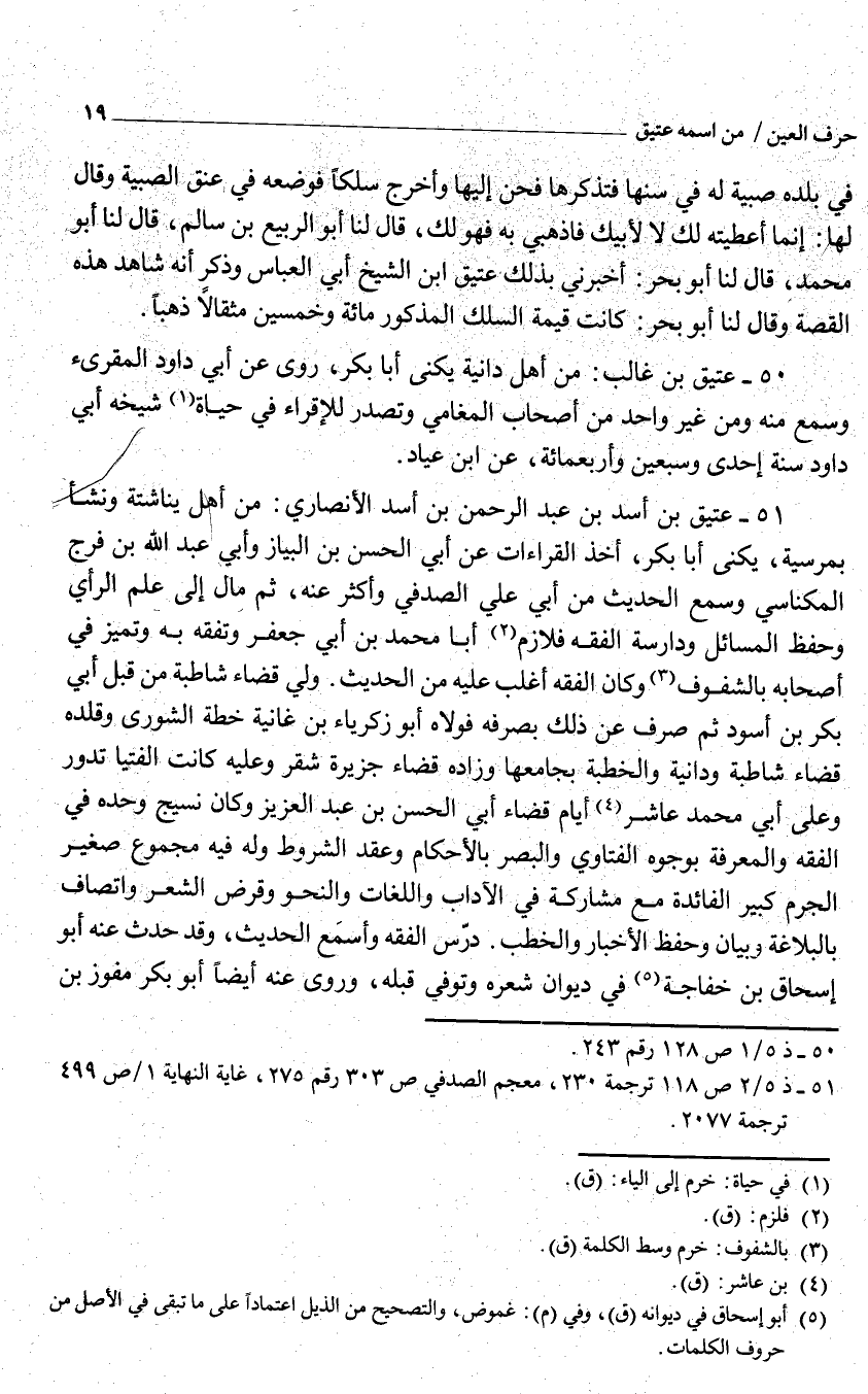 51 - عَتيق بن أَسد بن عبد الرَّحْمَن بن أَسد الْأنْصَارِيّ من أهل يناشتة وَنَشَأ بمرسية يكنى أَبَا بكر أَخذ الْقرَاءَات عَنْ أبي الْحَسَن بن البياز وَأبي عبد الله بن فرج المكناسي وَسمع الحَدِيث من أبي عَليّ الصَّدَفِي وَأكْثر عَنهُ ثمَّ مَال إِلَى علم الرَّأْي وَحفظ الْمسَائِل ودراسة الْفِقْه فلازم أَبَا مُحَمَّد بن أبي جَعْفَر وتفقه بِهِ وتميز فِي أَصْحَابه بالشفوف وَكَانَ الْفِقْه أغلب عَلَيْهِ من الحَدِيث ولي قَضَاء شاطبة من قبل أبي بكر بن أسود ثمَّ صرف عَن ذَلِك بصرفه فولاه أَبُو زَكَرِيَّاء بن غانية خطة الشوري وقلده قَضَاء شاطبة ودانية وَالْخطْبَة بجامعها وزاده قَضَاء جَزِيرَة شقر وَعَلِيهِ كَانَت الْفتيا تَدور وعَلى أبي مُحَمَّد عَاشر أَيَّام قَضَاء أبي الْحسن بن عبد الْعَزِيز وَكَانَ نَسِيج وَحده فِي الْفِقْه والمعرفة بِوُجُوه الفتاوي وَالْبَصَر بِالْأَحْكَامِ وَعقد الشُّرُوط وَله فِيهِ مَجْمُوع صَغِير الجرم كَبِير الْفَائِدَة مَعَ مُشَاركَة فِي الْآدَاب واللغات والنحو وقرض الشّعْر واتصاف بالبلاغة وَبَيَان وَحفظ الْأَخْبَار والخطب درس الْفِقْه وأسمع الحَدِيث وَقد حدث عَنهُ أَبُو إِسْحَاق بن خفاجة فِي ديوَان شعره وَتُوفِّي قبله وروى عَنهُ أَيْضا أَبُو بكر مفوز بن