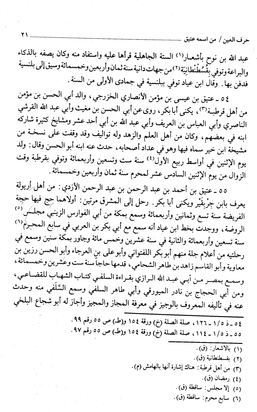 55 - عَتيق بن أَحْمد بن عبد الرَّحْمَن بن عبد الرَّحْمَن الْأَزْدِيّ من أهل أريولة يعرف بِابْن جربقير ويكنى أَبَا بكر رَحل إِلَى الْمشرق مرَّتَيْنِ أولاهما حج فِيهَا حجَّة الْفَرِيضَة سنة تسع وَثَمَانِينَ وَأَرْبَعمِائَة وَسمع بِمَكَّة من أبي الفوارس الزَّيْنَبِي مجْلِس الرَّوْضَة وَوجدت بِخَط ابْن عياد أَنه سمع مَعَ أبي بَكْر بْن الْعَرَبِيّ فِي سَابِع الْمحرم سنة تسعين وَأَرْبَعمِائَة وَالثَّانيَِة فِي سنة عشْرين وَخمْس مائَة وجاور بِمَكَّة سِنِين وَسمع فِي رحلتيه من أَعْلَام جلة مِنْهُم أَبُو بكر اللفتواني وَأَبُو عَليّ بن العرجاء وَأَبُو الْحسن رزين بن مُعَاوِيَة وَأَبُو الْقَاسِم زاهد بن طَاهِر الشحامي قدمهَا حَاجا سنة سِتّ وَعشْرين وَخَمْسمِائة وَسمع بِمصْر من أَبِي عبد الله الرَّازِيّ بِقِرَاءَة السلَفِي كتاب الشهَاب للقضاعي وَمن أبي الْحجَّاج بن نَادِر الميورقي وَأبي طَاهِر السلَفِي وَسمع السلَفِي مِنْهُ وَحدث عَنهُ فِي تأليفه بالوجيز فِي معرفَة الْمجَاز والمجيز وَأَجَازَ لَهُ أَبُو شُجَاع الْبَلْخِي