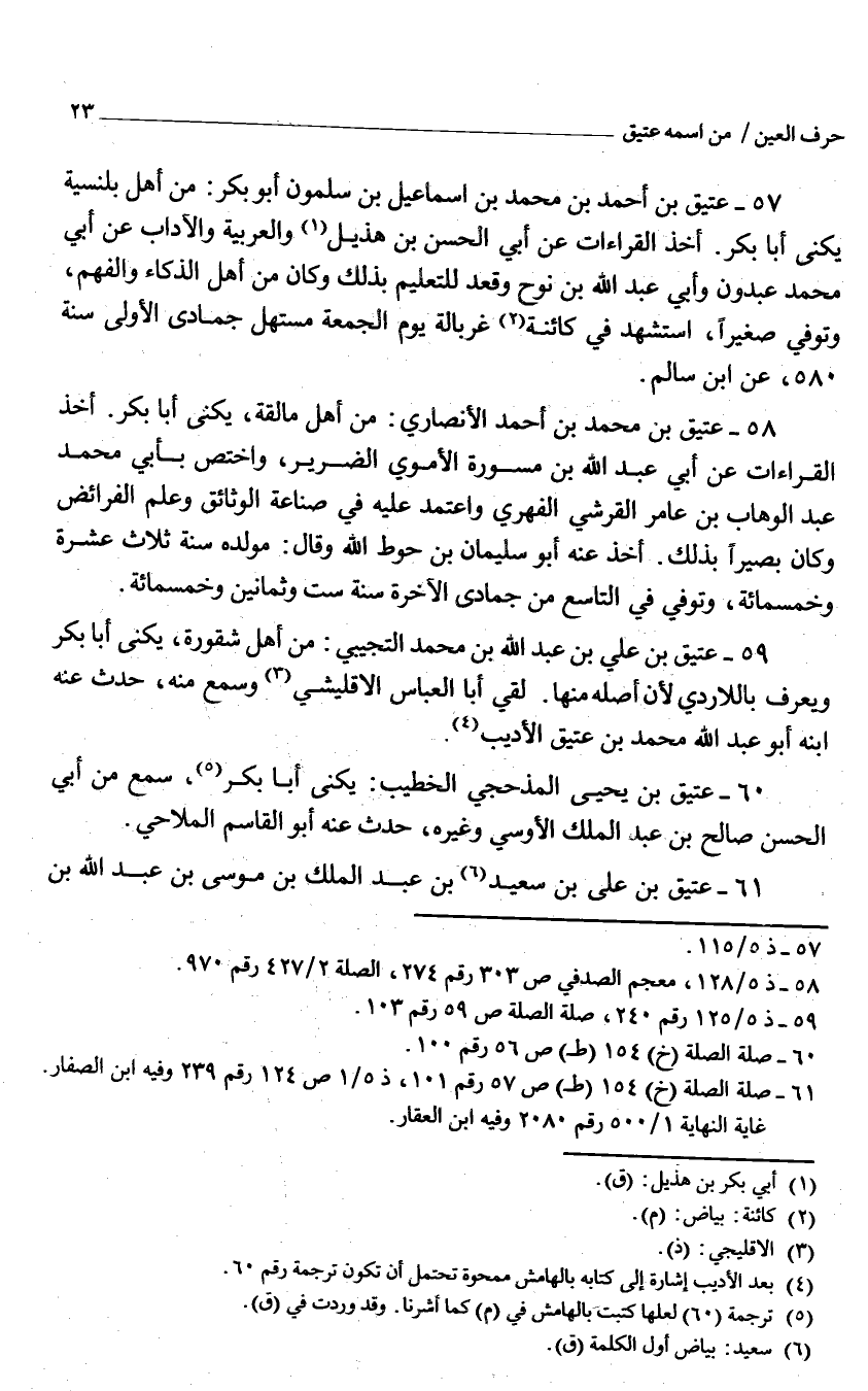 57 - عَتيق بن أَحْمد بن مُحَمَّد بن إِسْمَاعِيل بن سَلمُون أَبُو بكر من أهل بلنسية يكنى أَبَا بَكْر أَخذ الْقرَاءَات عَنْ أبي الْحسن بن هُذَيْل والعربية والآداب عَنْ أبي مُحَمَّد عبدون وَأبي عَبْد اللَّه بْن نوح وَقعد للتعليم بذلك وَكَانَ من أهل الذكاء والفهم وَتُوفِّي صَغِيرا اسْتشْهد فِي كائنة غربالة يَوْم الْجُمُعَة مستهل جُمَادَى الأولي سنة 580 عَن أبي سَالم