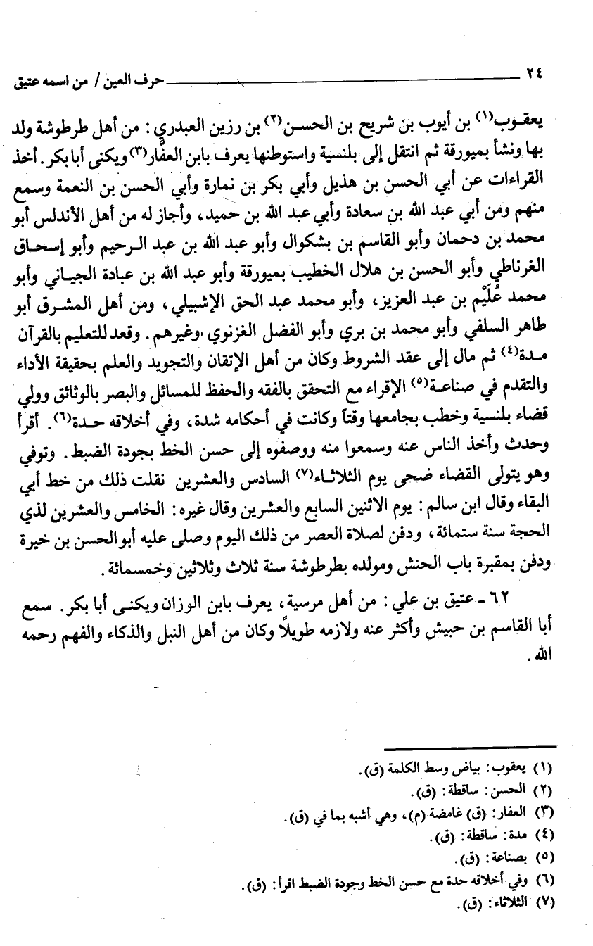 62 - عَتيق بن عَليّ من أهل مرسية يعرف بِابْن الْوزان ويكنى أَبَا بكر سمع أَبَا الْقَاسِم بن حُبَيْش وَأكْثر عَنهُ ولازمه طَويلا وَكَانَ من أهل النبل والذكاء والفهم رَحمَه الله